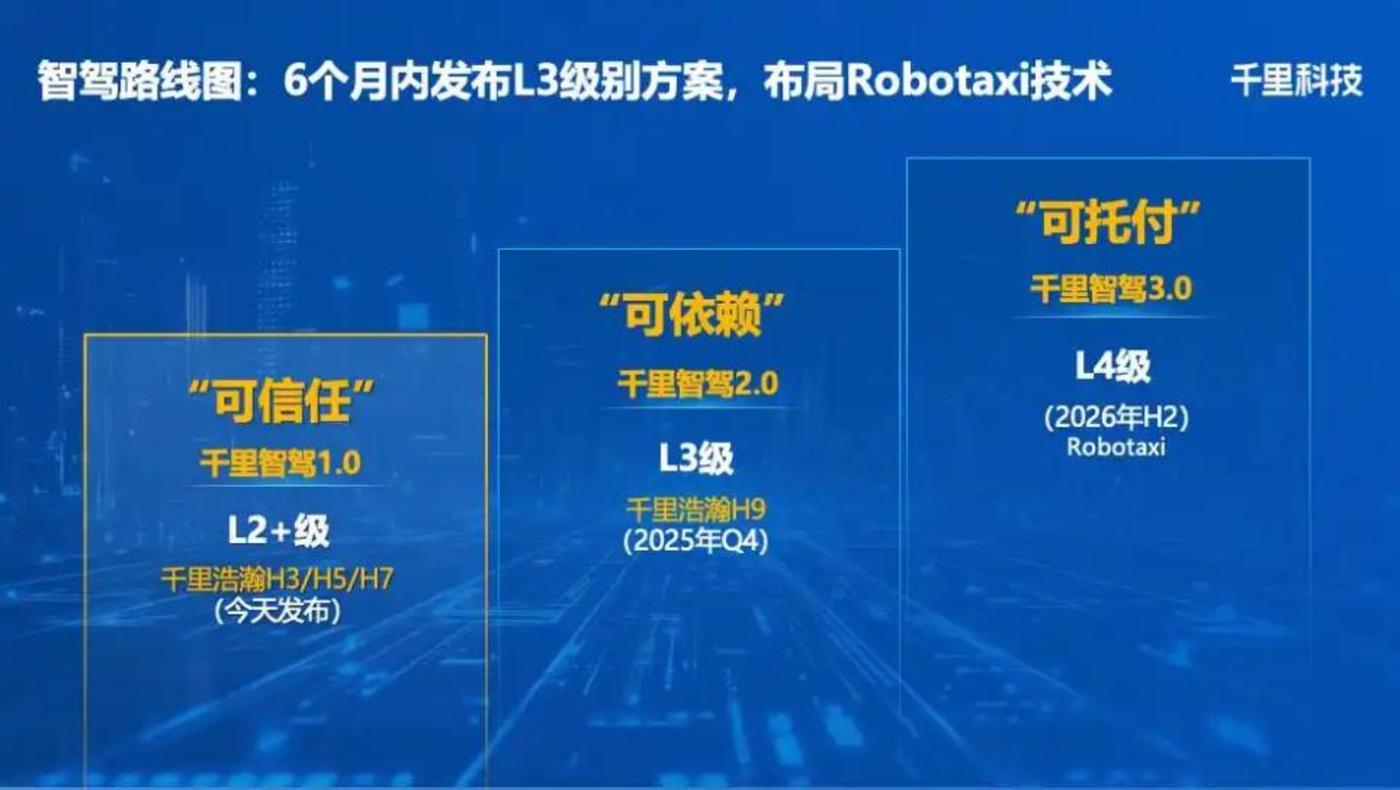 根据规划,千里科技将在未来六个月内发布L3级别智驾方案——千里智驾2.0,明年下半年还要推出Robotaxi场景的L4级智驾方案——千里智驾3.0。