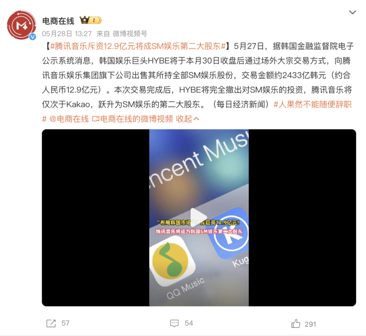 5月27日,腾讯音乐(TME)通过战略投资,成韩国三大娱乐公司之一SM娱乐股东的消息,引行业、粉丝关注。