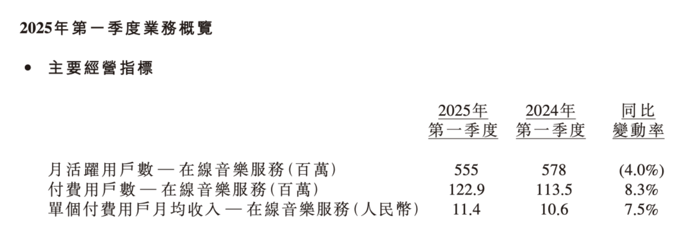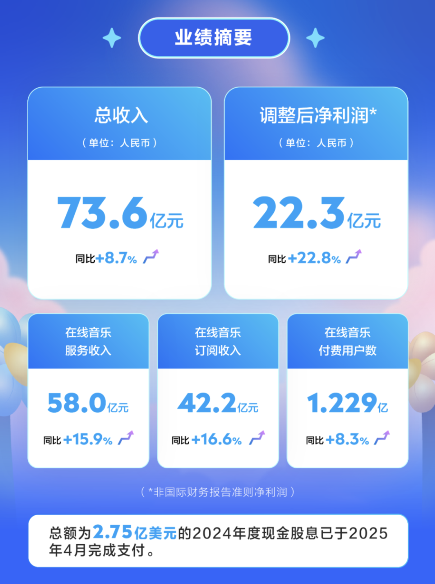 前阵子,TME发布了2025年第一季度财报,几个核心指标增长亮眼:总收入同比增长8.7%至73.6亿元,调整后净利润同比增长22.8%至22.3亿元,在线音乐业务持续增长、占比总收入近8成,在线音乐付费用户数增长至1.229亿。