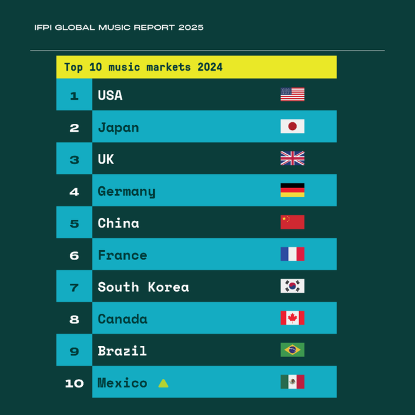 而且音乐产业全球化的背景下,中国音乐产业也成为国际重点市场。根据国际唱片协会(IFPI)发布的《2025全球音乐报告》,2024年全球十大音乐市场中,中国位列全球第五,增速达到9.6%。就具体市场来看而言,短视频的快速发展,音乐节、演唱会等现场演出的复苏和狂飙,都给国内的音乐产业发展按下了加速键。