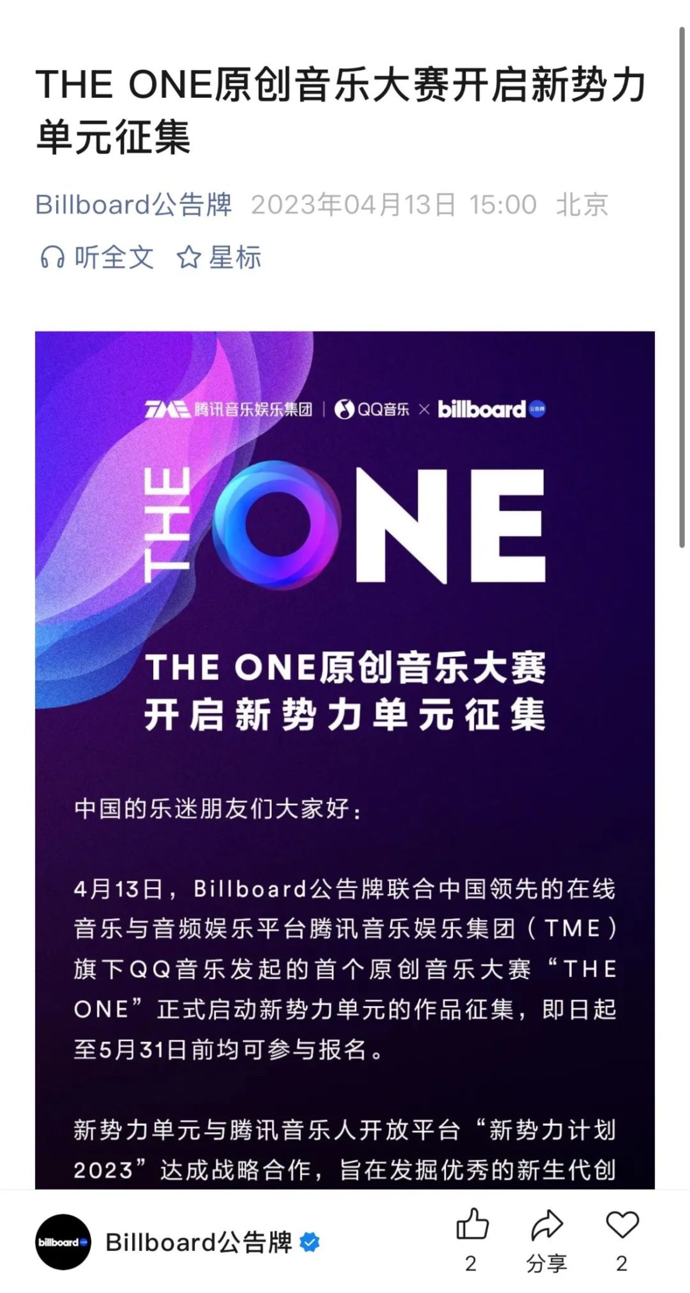 一方面是这些合作给国内音乐市场的加持,另一方面,TME与海外音乐巨头的合作有助于带动中国音乐的国际化,将更多中国音乐、音乐人推向国际舞台。例如此前TME就与Billboard就联合发起了“THE ONE”原创音乐大赛,助力优质的音乐人和作品走出国门。