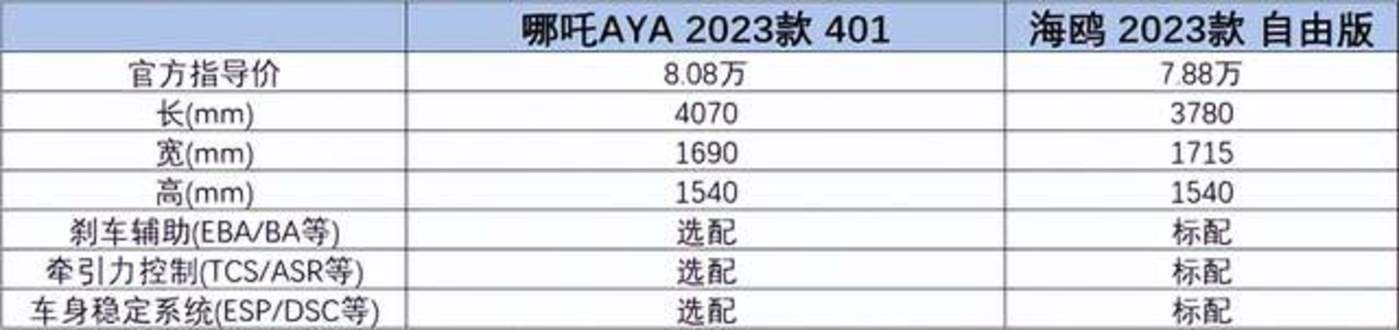 更大的冲击来自低端市场的价格战。比亚迪持续下探10万元级别新能源汽车的价格底线,对哪吒V和哪吒U的市场形成了直接冲击,动摇了哪吒的销量基本盘。以哪吒AYA 401为例,「定焦One」整理了2023款哪吒AYA 401和比亚迪海鸥自由版的对比信息,两款车虽价格相近,但在主动安全如刹车辅助、牵引力控制、车身稳定系统等方面配置差距较为明显,这三者比亚迪海鸥统统标配,哪吒AYA只是选配。