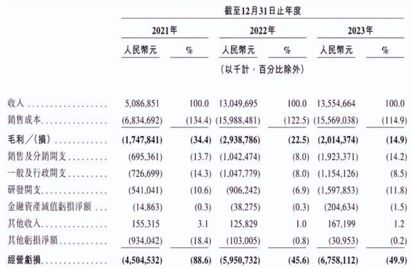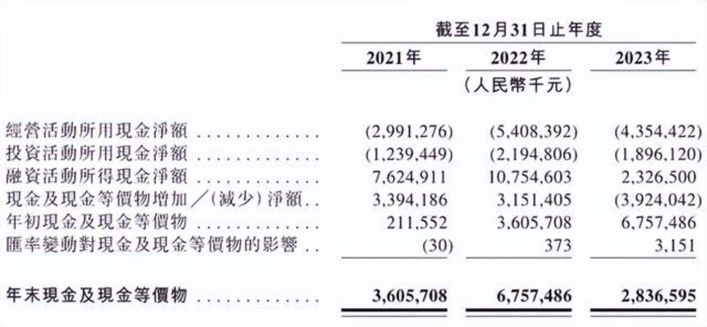 根据招股书,2021年-2023年,哪吒的净亏损分别是48.4亿元、66.7亿元、68.7亿元,看不到减亏迹象。同时,经营性现金流一直未能转正,同期分别为-29.91亿元、-54.08亿元、-43.54亿元,意味着哪吒并没有造血能力。