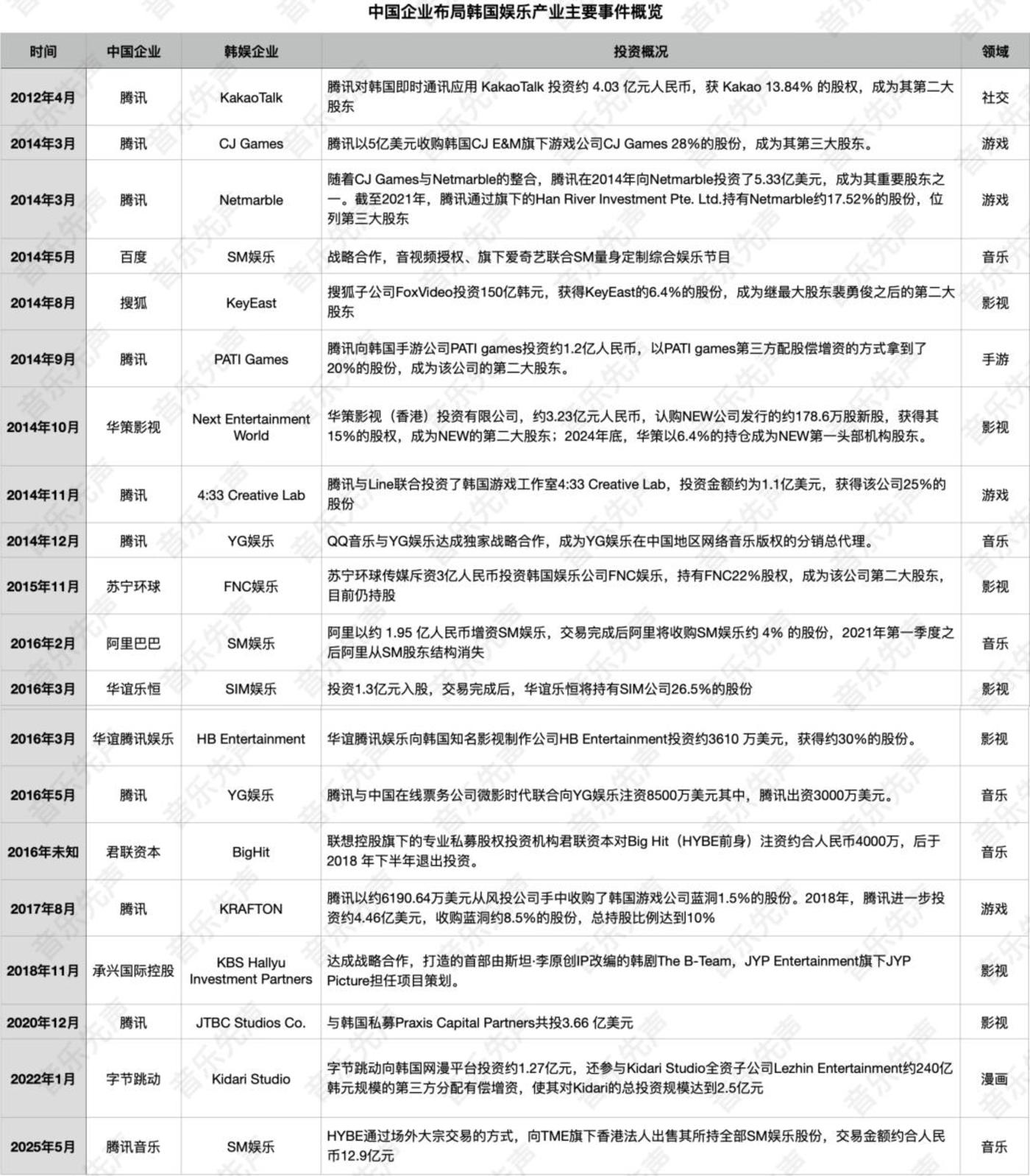 可以看到,在限韩令前的数年间,国内资本对韩国娱乐产业展开了前所未有的密集布局,涵盖艺人经纪、内容开发、影视联合制作、音视频版权分销等多个关键环节,力图深度嵌入韩娱体系。其中,腾讯无疑是最为活跃的代表,其在社交、游戏、音乐、影视等多个领域频频出手。