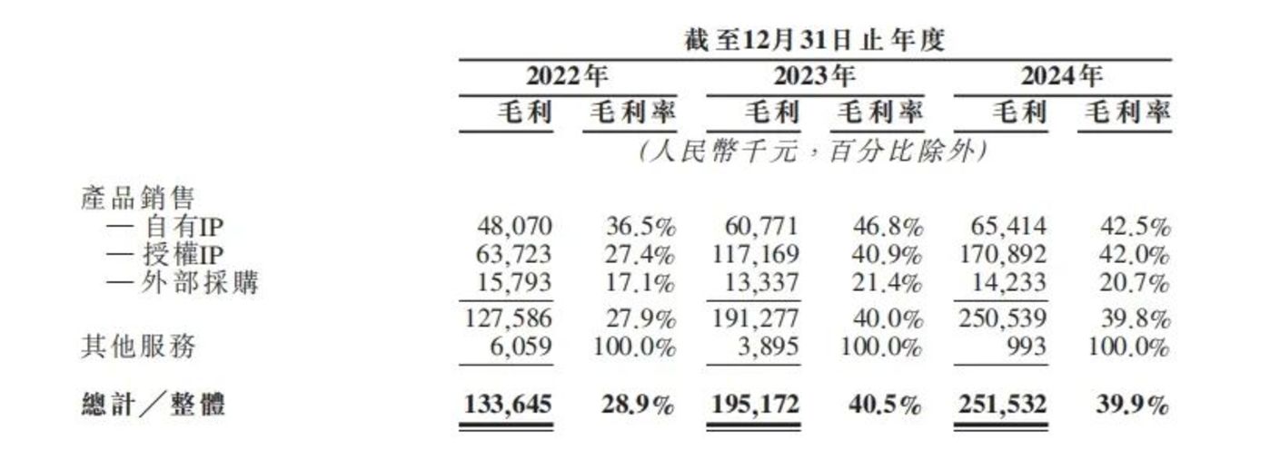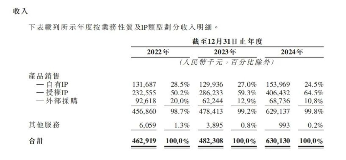 同样的IP生意模式下,目前52TOYS最赚钱的产品仍然是蜡笔小新、草莓熊等授权IP产品,且在营收占比中越来越大。根据招股书显示,2022年至2024年,52TOYS授权IP产品的营收分别为2.33亿元、2.86亿元及4.06亿元,占总营收的比重分别为50.2%、59.3%和64.5%。