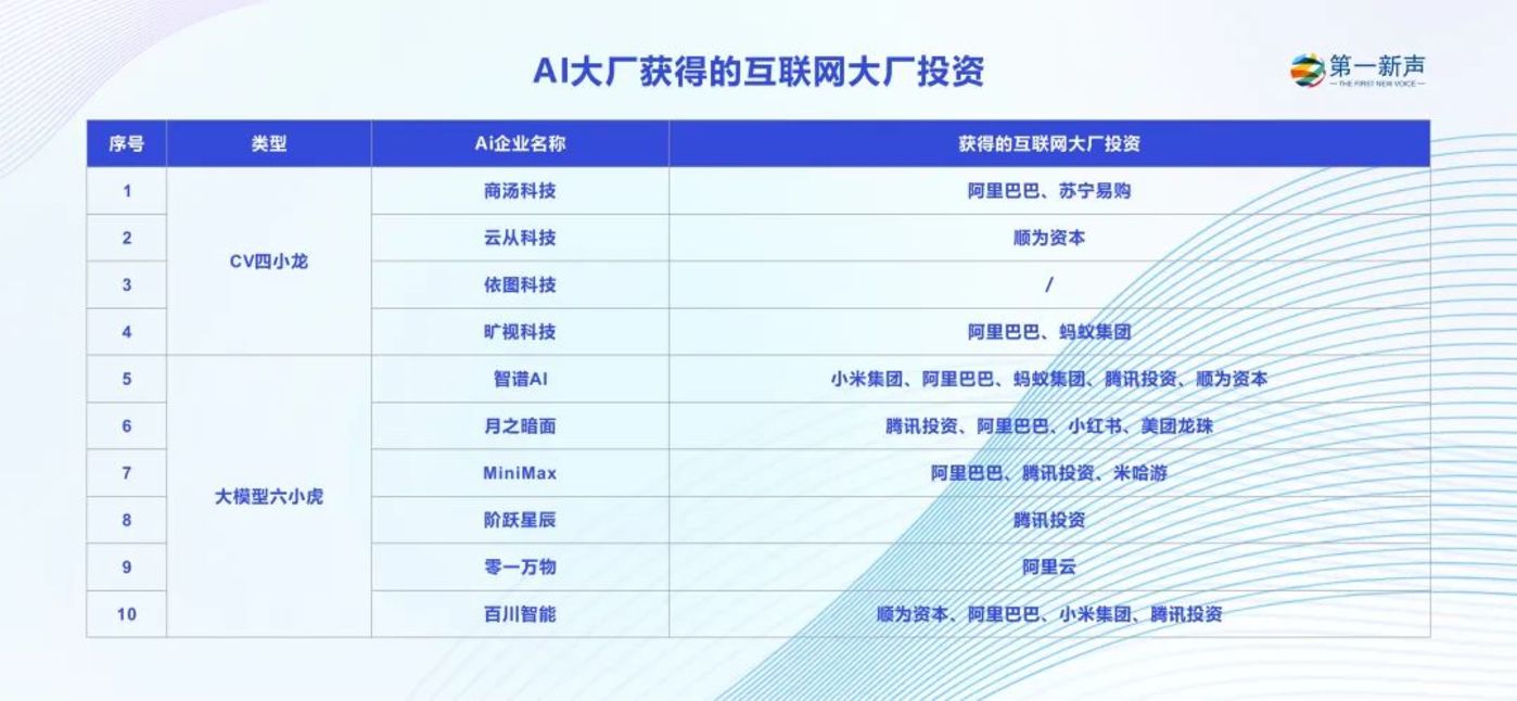 这两轮技术浪潮不仅定义了不同阶段的行业焦点,更催生了一批标志性的明星企业:从早期的“CV四小龙”到近年的“大模型六小虎”,这些逐渐在热度中成长为“AI大厂”背后,或多或少都接受到过来自传统大厂的资金支持。