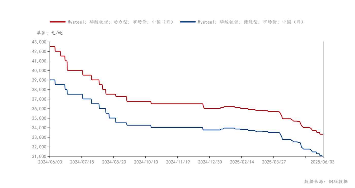 不过,尽管诸多企业停止扩产步伐,但依然有不少的产能仍在按计划释放,磷酸铁锂价格继续下行。根据上海钢联提供的数据,6月3日,动力型磷酸铁锂市场价格区间在31750-34750元/吨,储能型磷酸铁锂市场价格区间在30250-31750元/吨,较2月6日价格下降2950元。