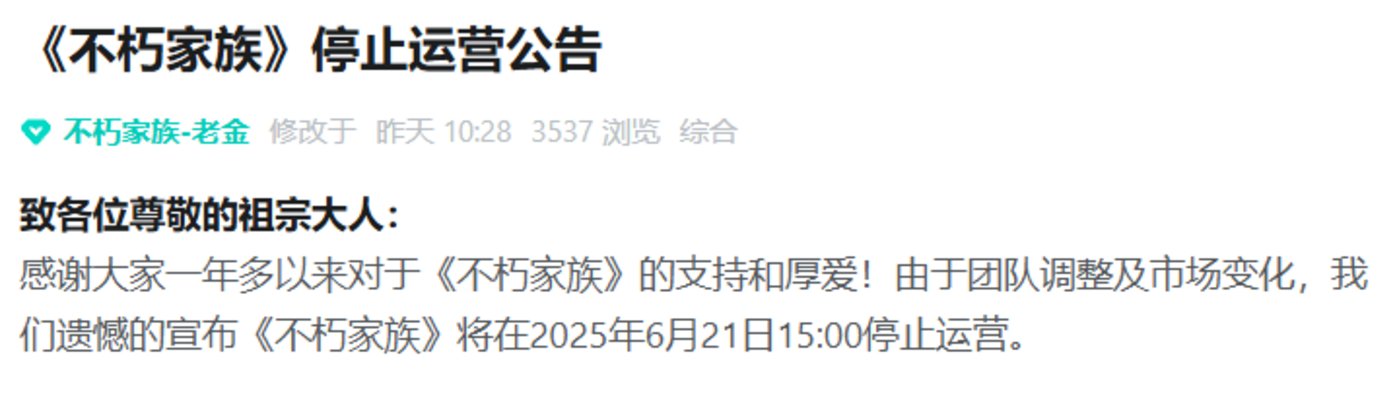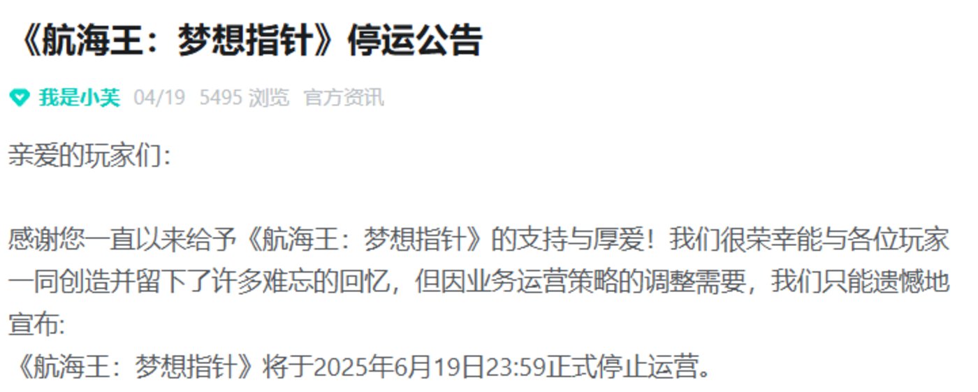 而在近几月,吉比特旗下雷霆游戏还相继宣布两款游戏的停运,分别为《不朽家族(代号:M66)》《航海王:梦想指针》。