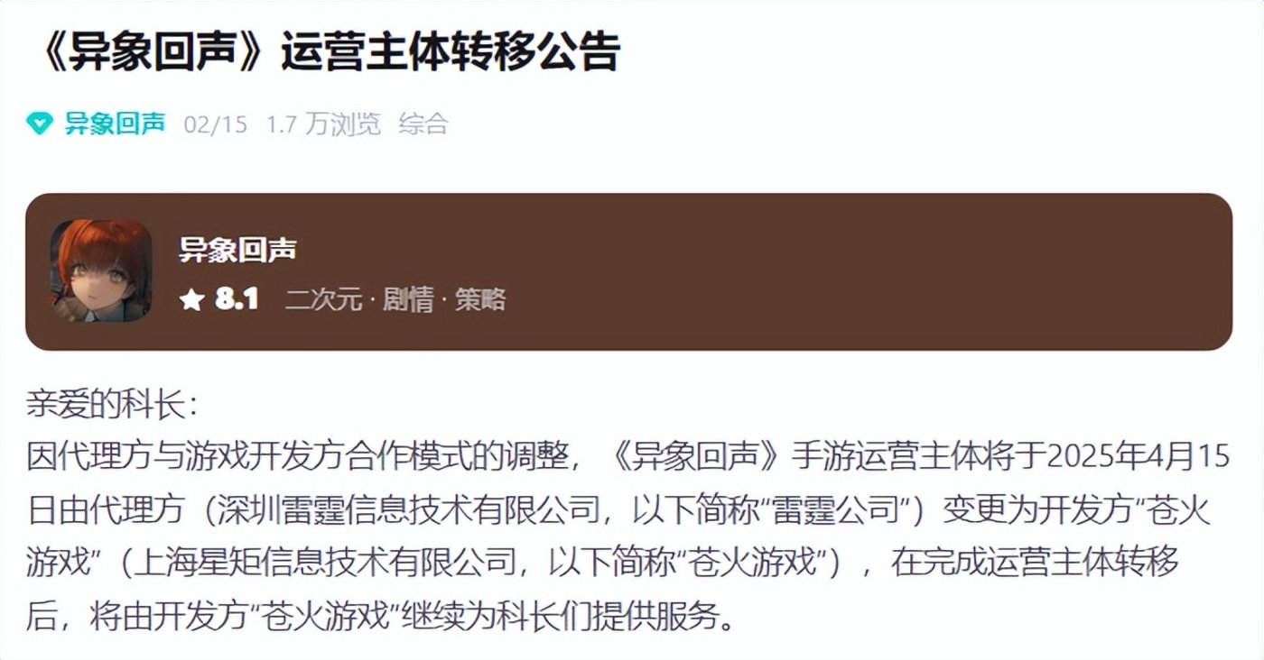 此外,今年2月,上线没多久,二次元游戏《异象回声》的发行权从雷霆游戏转交回开发方。
