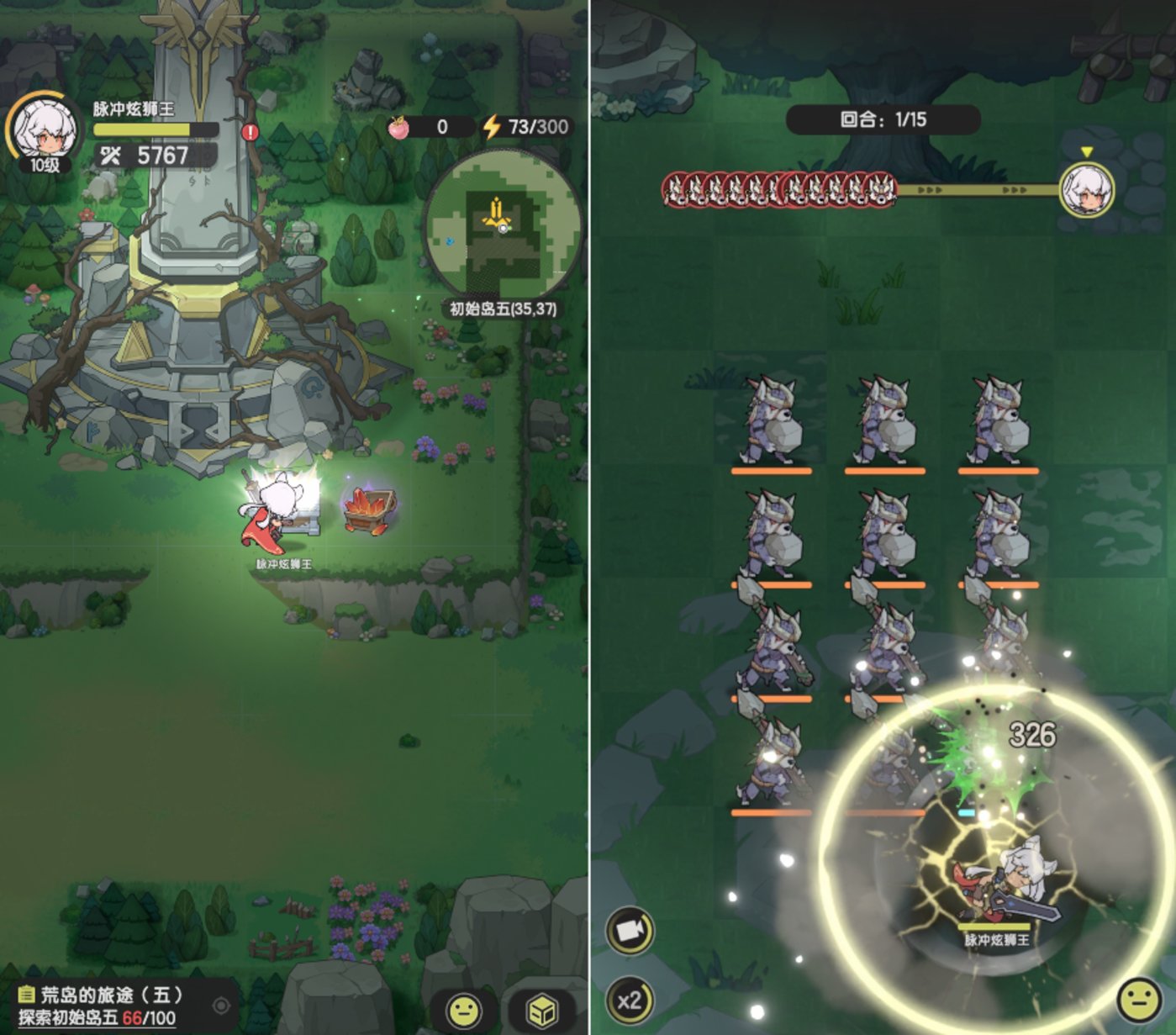 而在探索玩法界面,《杖剑传说》则采用了“轰隆隆佣兵团like”的竖屏俯视角,“走格子”玩法的加入,则让游戏战斗显得更加规整和复古。当然,这周“走格子”并不限体力,随着玩家逐渐探索,迷雾散开,神庙、传送点以及雕像也沐浴在阳光下——这很开放世界。走格子也改变了技能布置策略,不同技能覆盖的格数不同。通过搭配技能,《杖剑传说》用"炸屏数字"给玩家带来战斗爽感。