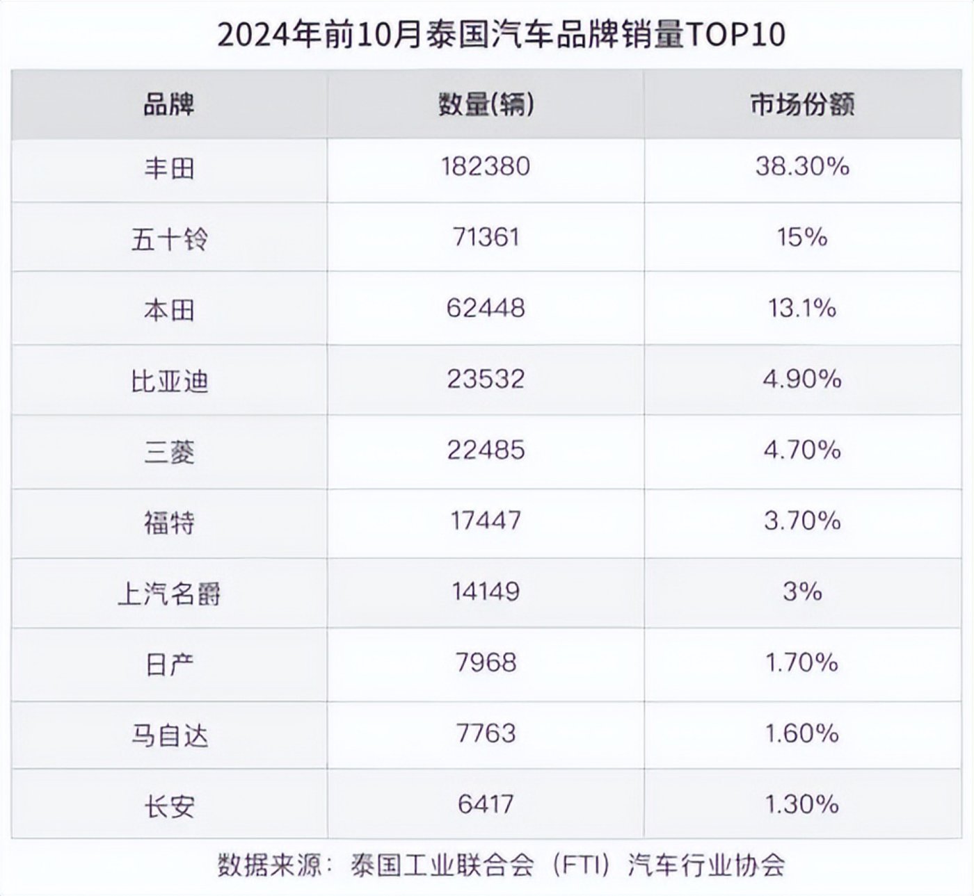 最好的例子同样是在泰国,泰国工业联合会的数据显示,在2024年1-10月销量排名前10的汽车品牌中,出现了比亚迪、上汽名爵和长安汽车三个中国品牌。其中比亚迪以4.9%的市场份额挤进销量TOP4车企之列,相比上一年进步明显。