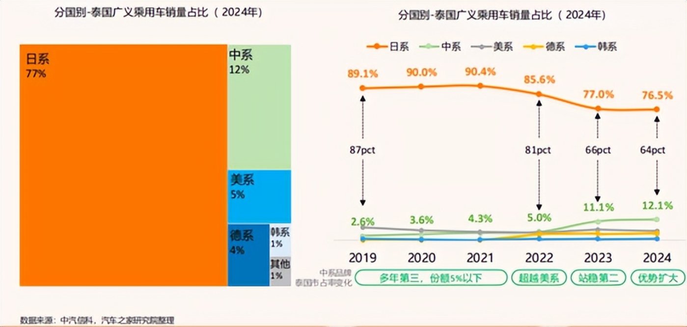 而在印尼市场,2024年日系车的市场份额相比2019年也有下滑6%,在马来西亚则下滑4个百分点,与之形成鲜明对比的,是中国车渗透率的攀升。甚至,据路透社报道,本田汽车计划到2025年停止位于泰国阿瑜陀耶府工厂的汽车生产,此前,铃木汽车、斯巴鲁汽车双双宣布将关闭泰国工厂。