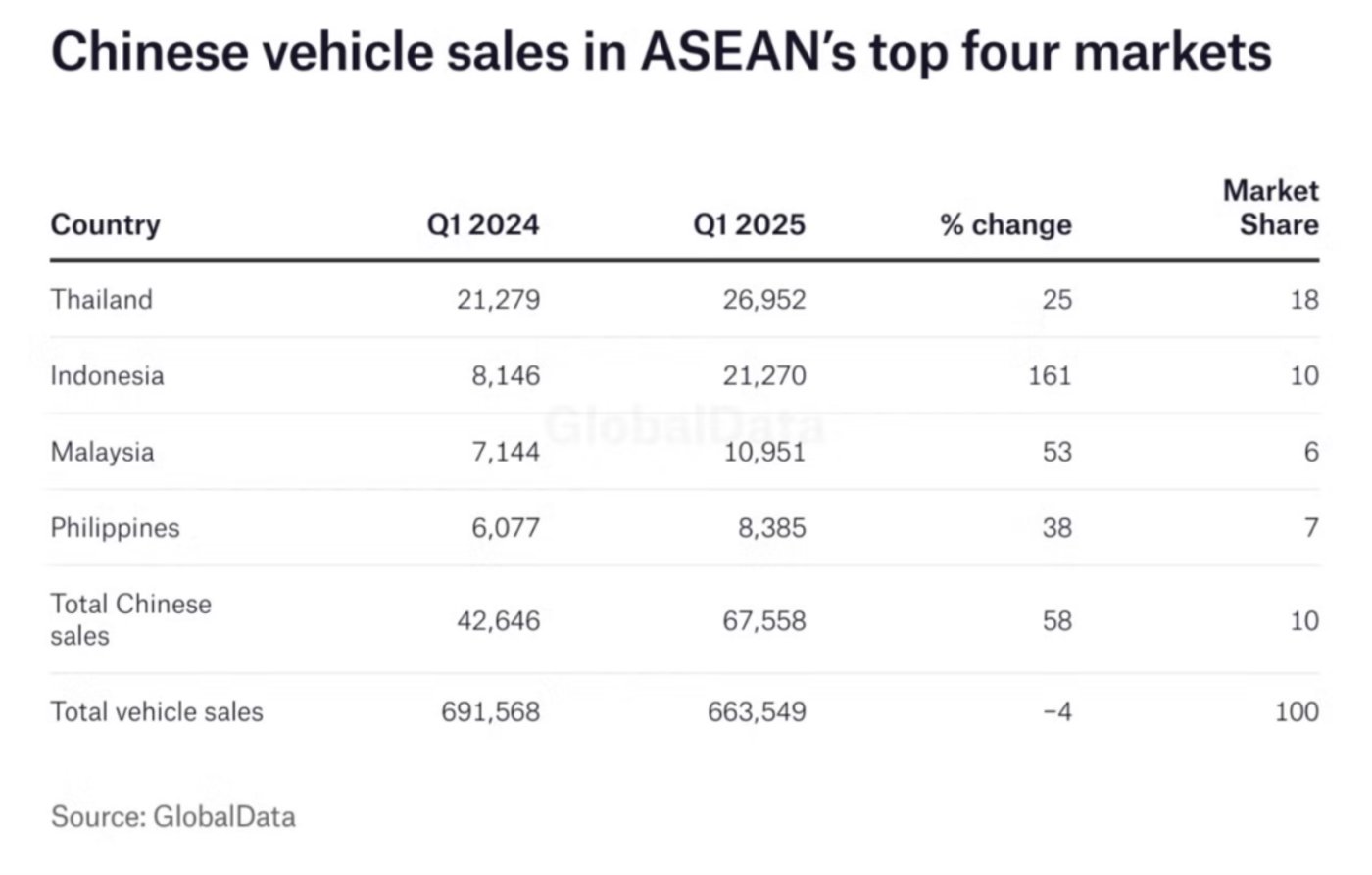 2025年第一季度,中国品牌汽车在印尼、马来西亚、泰国和菲律宾等东南亚四大主要市场的销量较去年同比增长了58%以上。