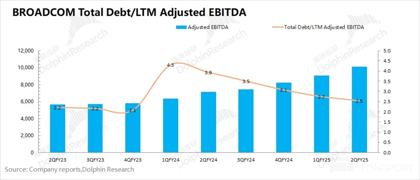 ②对债务端的影响:海豚君引入了债务偿还指标(Total Debt/LTM Adjusted EBITDA),经测算公司该指标在本季度进一步下降至 2.5。而公司过往每次的收购并表都发生在指标回落至 2 附近的时候,随着该指标的持续下滑,海豚君认为本次收购 VMware 对公司债务端的影响也基本完成消化;