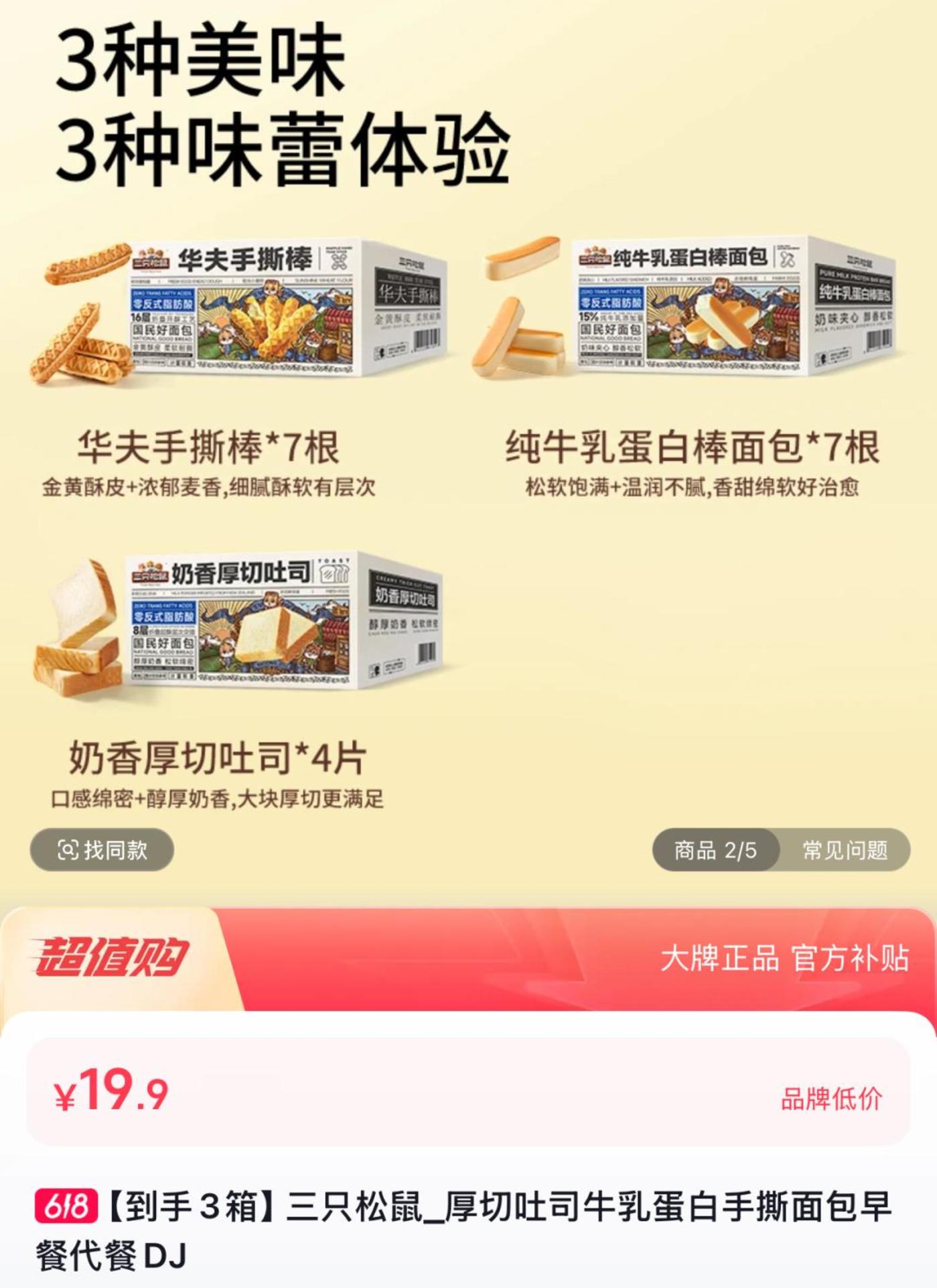 “我们完全沿用了此前19.9元夏威夷果的爆品打造逻辑 —— 精准锚定19.9元黄金价格带,验证发现该策略在面包品类同样适用。” 鼠飞轩告诉剁椒,当某区域品牌主推牛乳吐司时,三只松鼠创新推出「水牛乳千层吐司」;同时,针对消费者多口味一站式购齐的需求,三只松鼠实现了19.9元三箱多口味组合装的极致性价比,直接击中传统模式的消费痛点。
