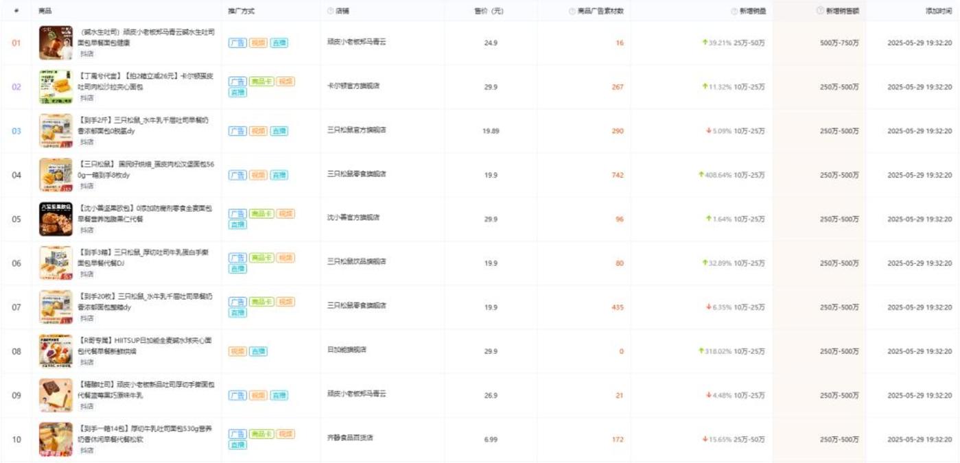 有米云数据显示,近30天面包品类热销榜单中,三只松鼠占据前十席位的近半数,其整箱装面包价格均控制在20元以下,以极致性价比和零食渠道复用的策略快速渗透电商平台和现存市场空间。