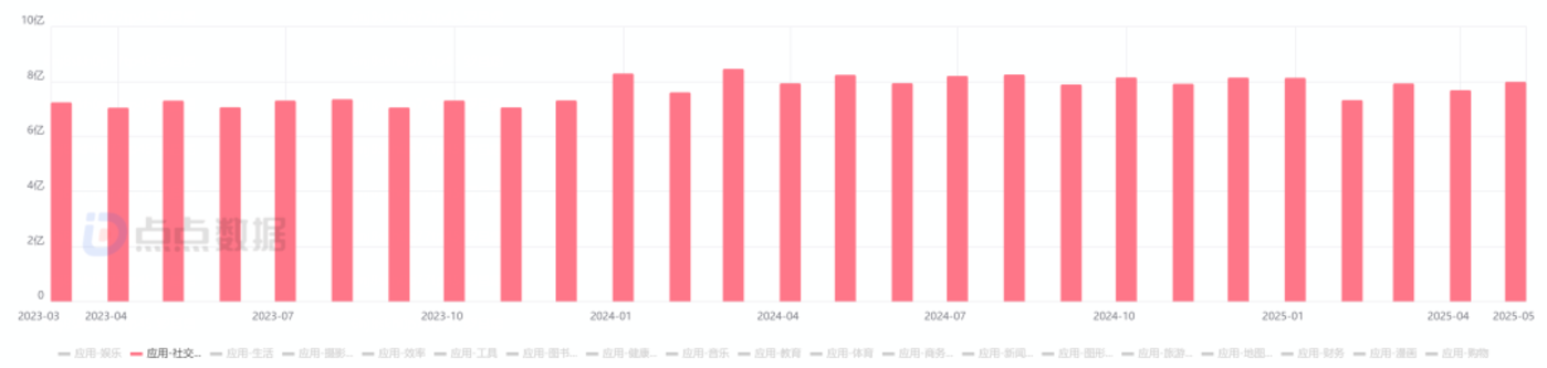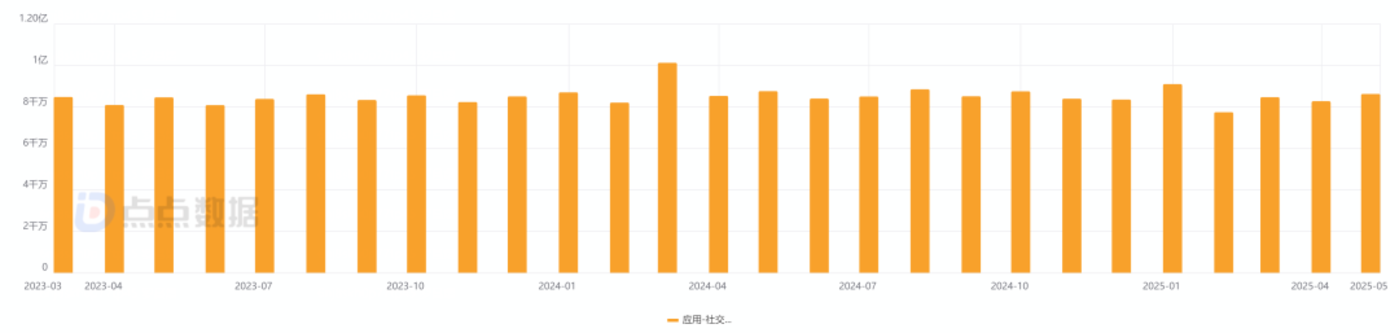 美国社交类别应用月下载量趋势(2023.3-2025.5).点点数据