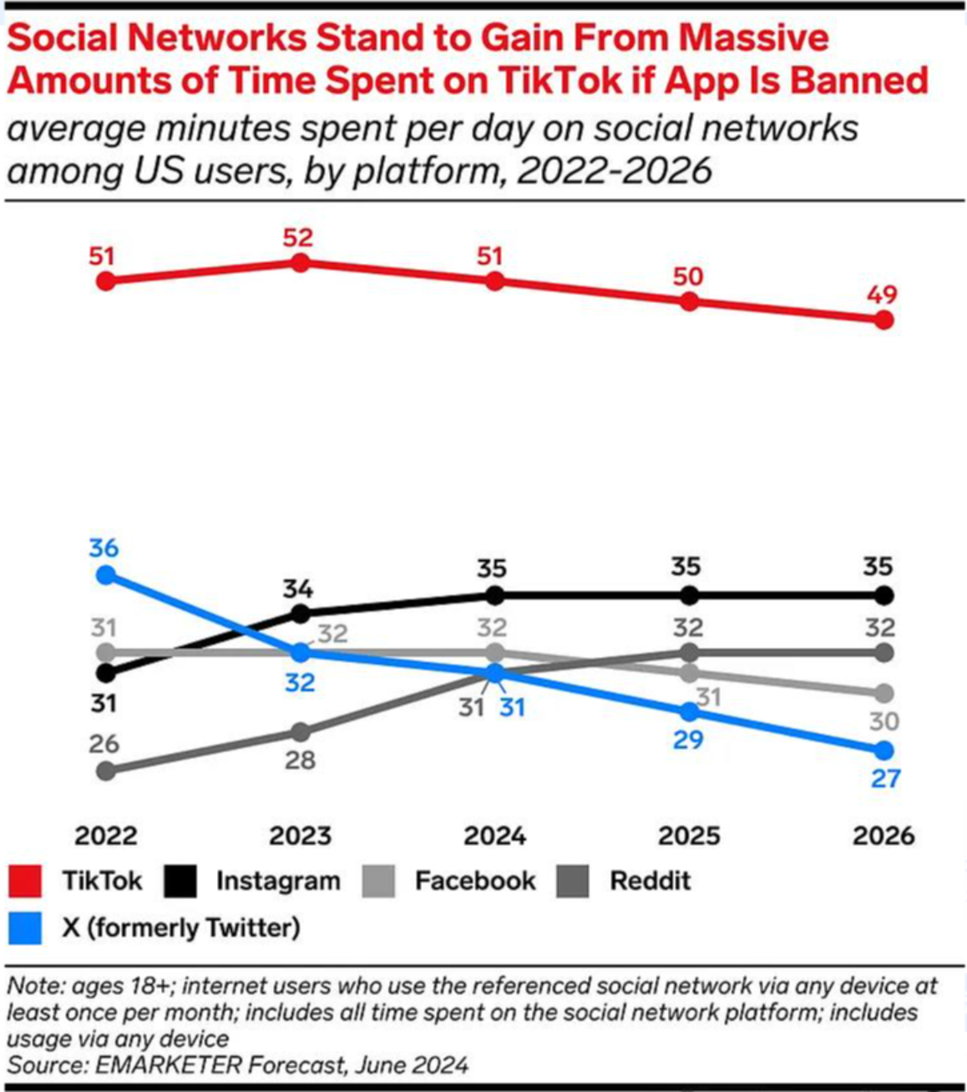 除了在广告市场上存在直接的竞争关系,TikTok与这两家在用户属性上也有着极高的重合度。eMarketer数据显示,2024年,TikTok用户每天在TikTok上花费的时间(51分钟),Instagram只有35分钟。但两者用户的重合比高达75%。如果TikTok退出,大量的使用时间将流向Instagram。