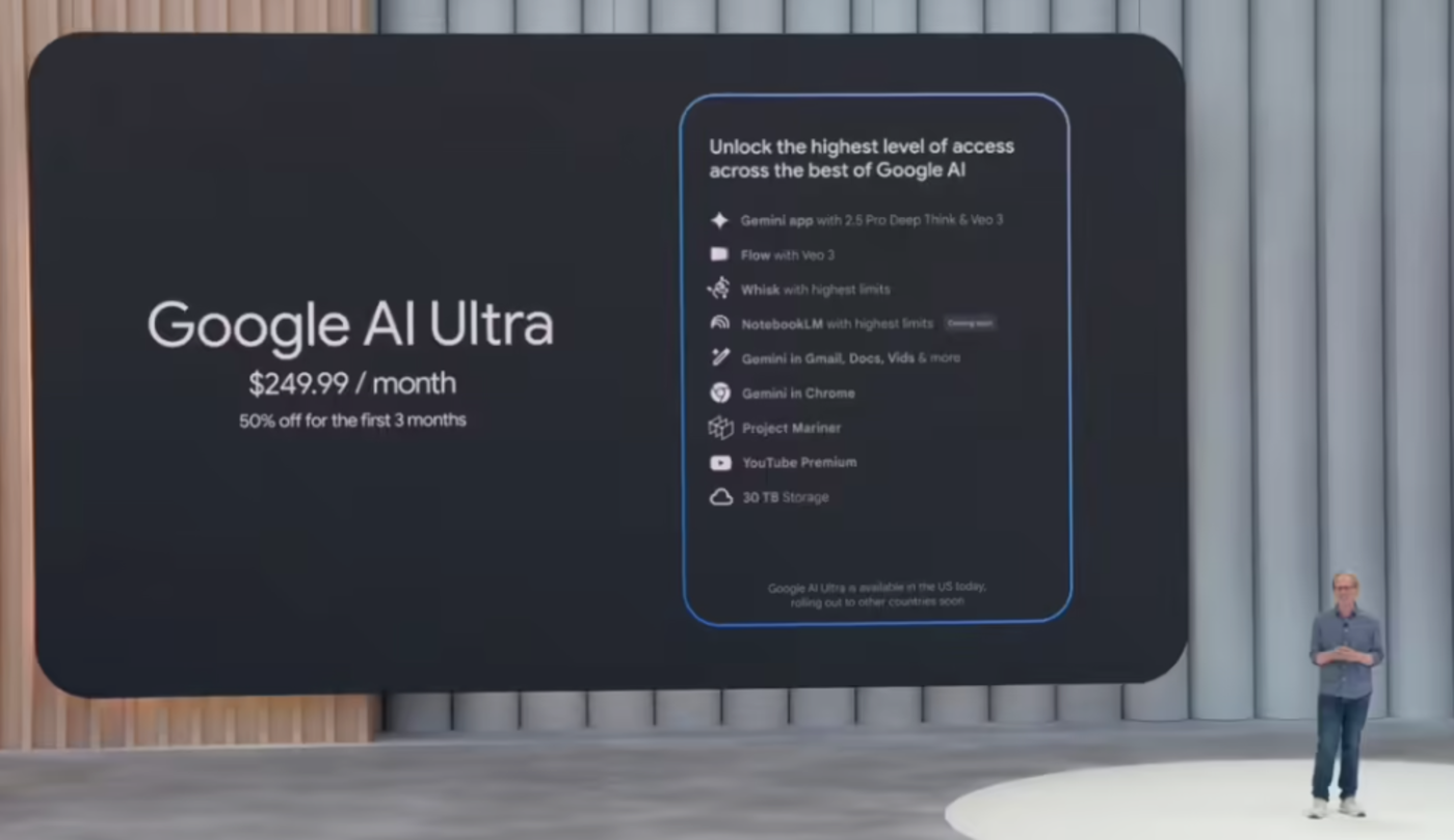 并且,就在各类AI产品尚未站稳脚跟的同时,谷歌同步发布了订阅费高达249.99美元(约合人民币1800元)的AI Ultra月度订阅计划,高于月收费200美元的ChatGPT Pro。而将Veo 3、Deep Think、Project Mariner等功能捆绑销售的谷歌全家桶计划,让仅需单项功能的用户也不得不支付昂贵的全套订阅费。