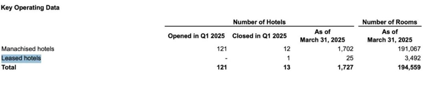 规模增长,随之而来的是收入增长。2025年一季度,加盟管理酒店的收入同比增长23.5%至10.32亿元,给集团贡献超一半收入。相比之下,亚朵自营租赁酒店数量同比减少19.4%,从31家降至25家,收入也从1.68亿元同比下降23.5%至1.29亿元。