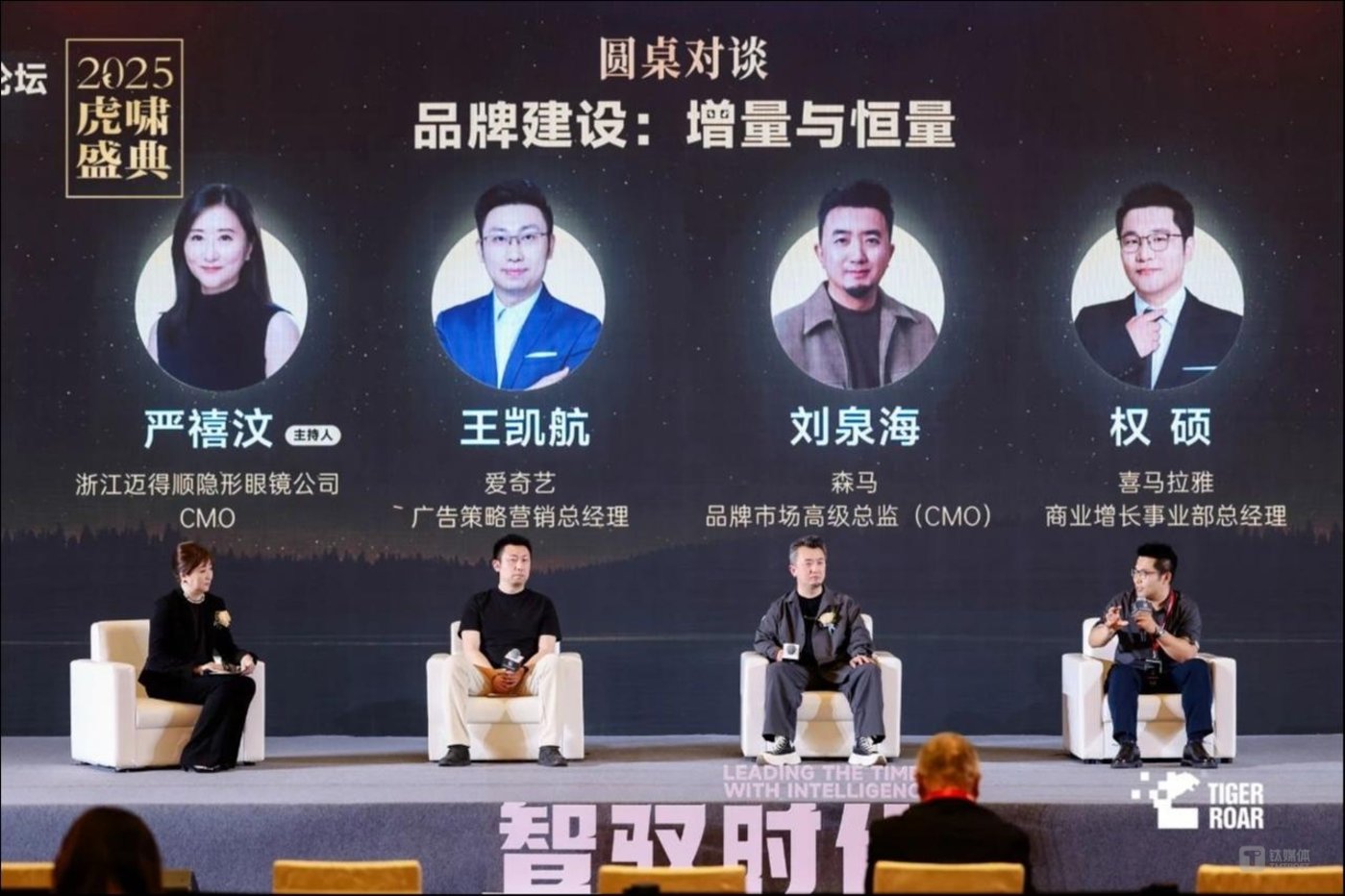 ▍随后,盛典进行到《品牌建设:增量与恒量》的圆桌对话环节,主持人是严禧汶,对话嘉宾为爱奇艺广告策略营销总经理王凯航、森马品牌市场高级总监(CMO)刘泉海和喜马拉雅商业增长事业部总经理权硕。