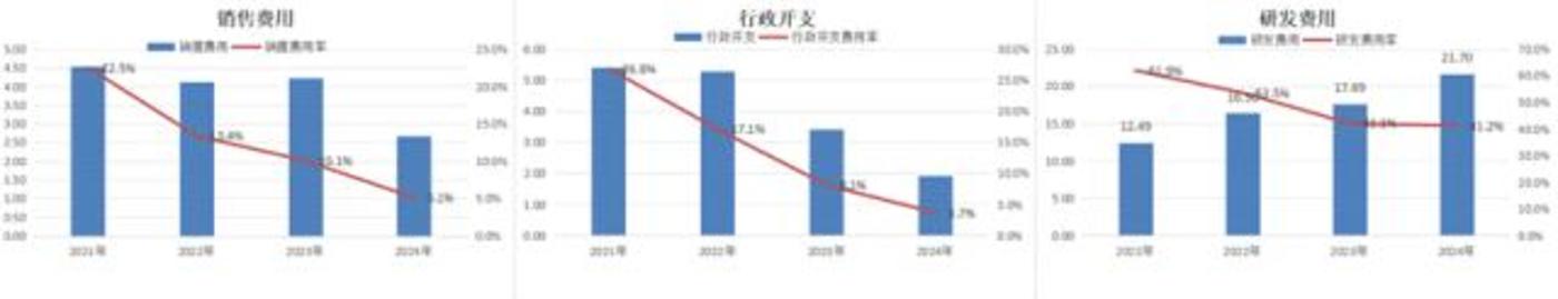 总体看来,第四范式的费用率水平从21年的111.3%降至24年的50%。
