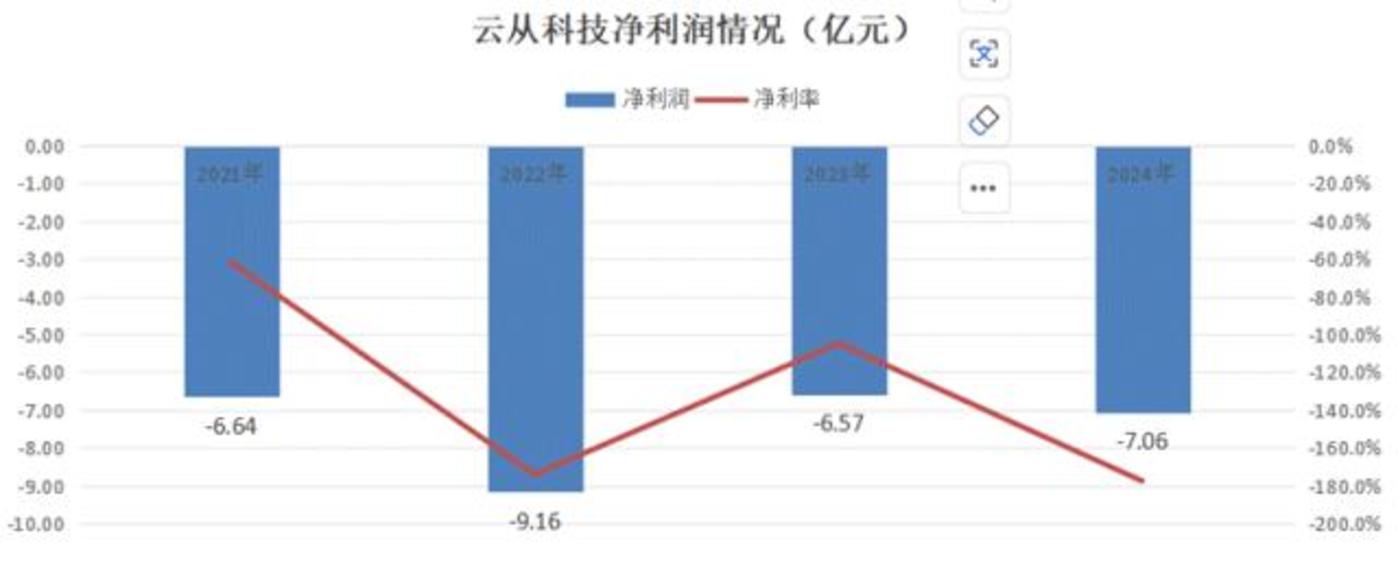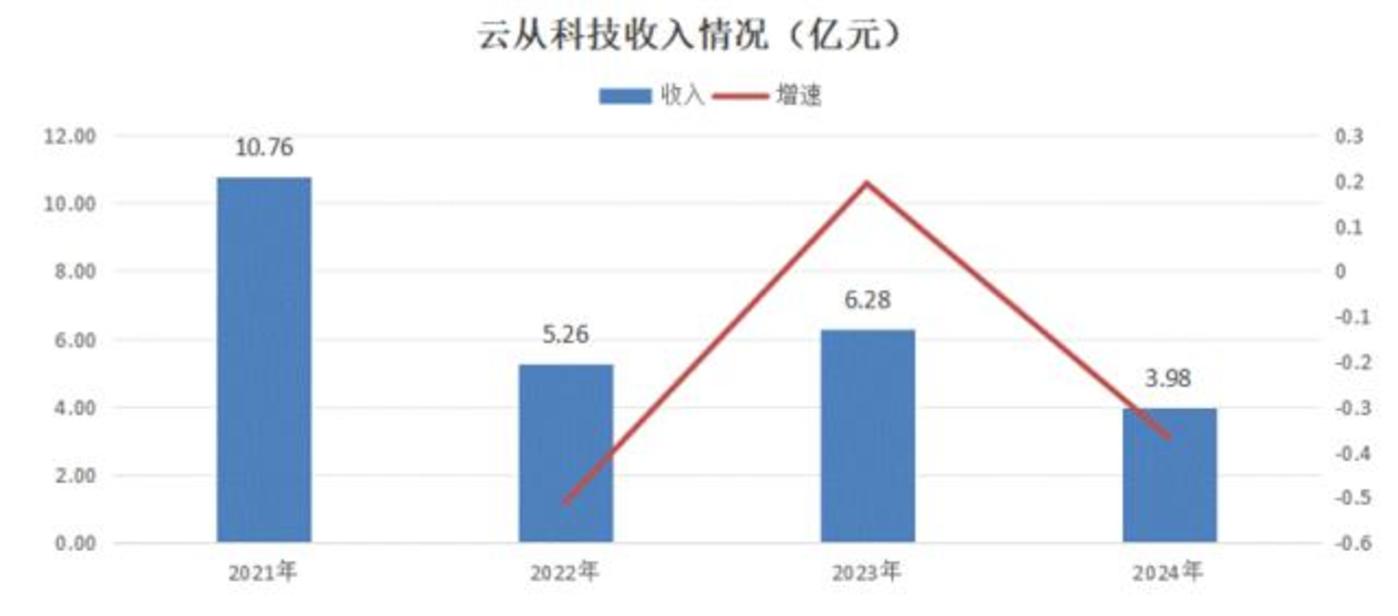 2024年,云从实现收入为3.98亿元,较去年同比下降36.7%;同期亏损7.06亿元。