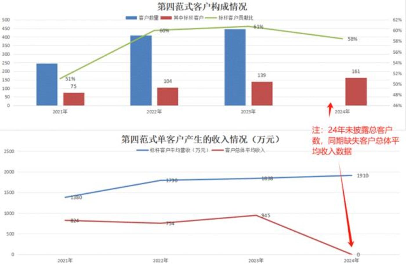 然而,我们认为公司持续拓展该等用户的压力不小,原因是用户基数变大,扩张过程本身面临的压力也将变大,可以看到,其标杆用户21年-23年保持着每年30个新增用户的速度进行触及,到24年新增标杆用户数量将至22,这是近几年最低的水平,对应地,标杆对公司收入贡献占比也从61%降低至58%,首次出现下滑。