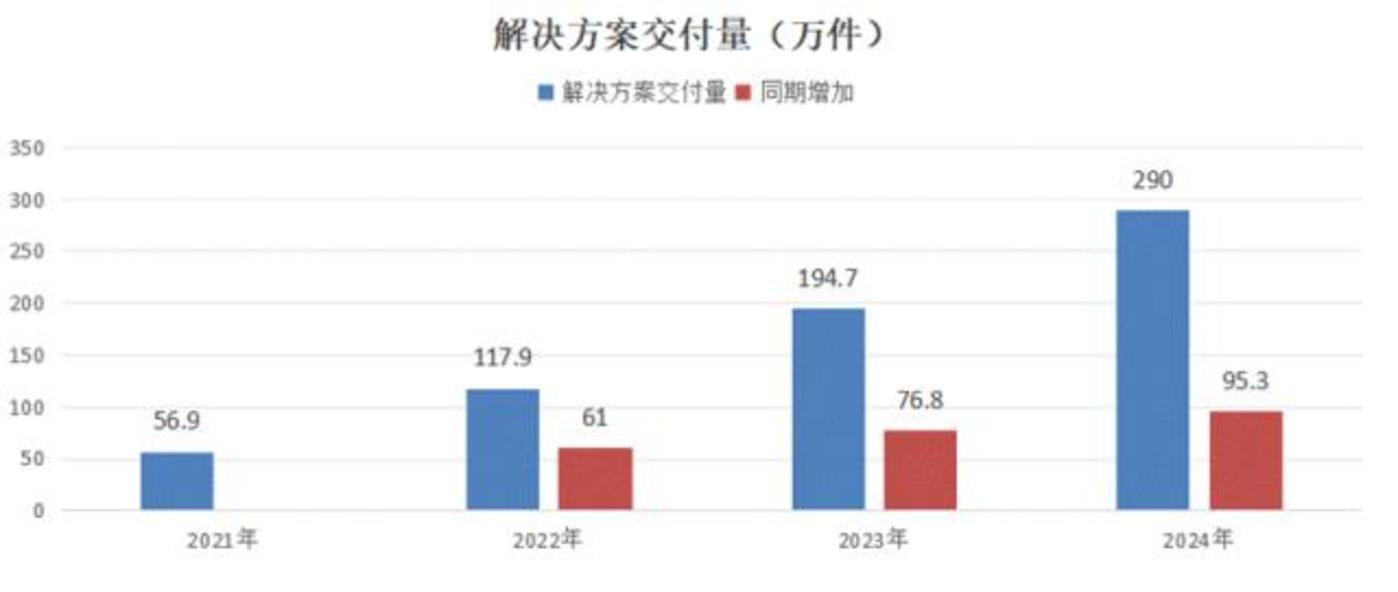 24年,产品解决方案业务(6.6亿元)对公司营收的贡献比为27.9%。同时,解决方案交付量扩张到290万件。