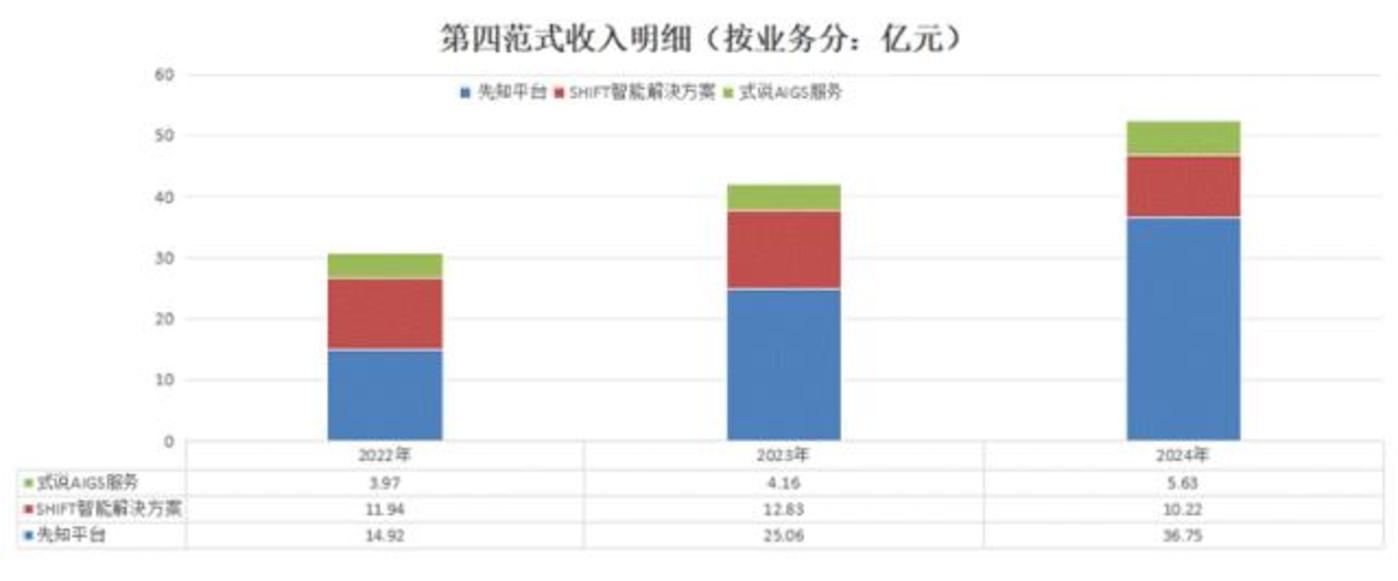 21年-24年间,先知平台业务对公司收入的贡献比最高为24年的69.9%,最低在22年的48.%,也是在占比最低的这一年,公司收入明细中的业务分类从原先的先知平台及产品+应用开发及其他服务两项,进一步拆分为三项,分别是: