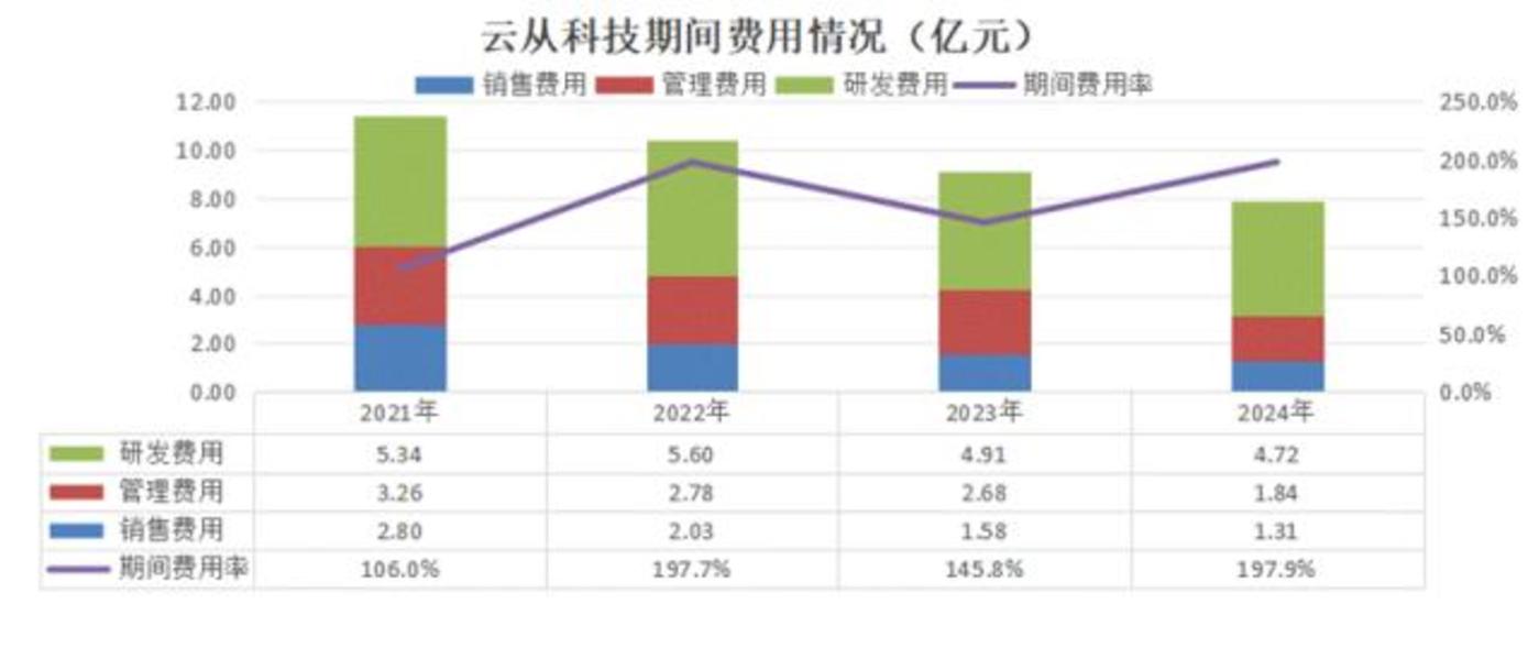 到2024年,市场拓展不及预期的云从科技,期间费用较上市之之初已经缩减了接近一年的收入(3.5亿元)到7.9亿元,期间费用率还是接近200%。几经收缩,24年云从还是亏损7.06亿元,净利率为-177.4%