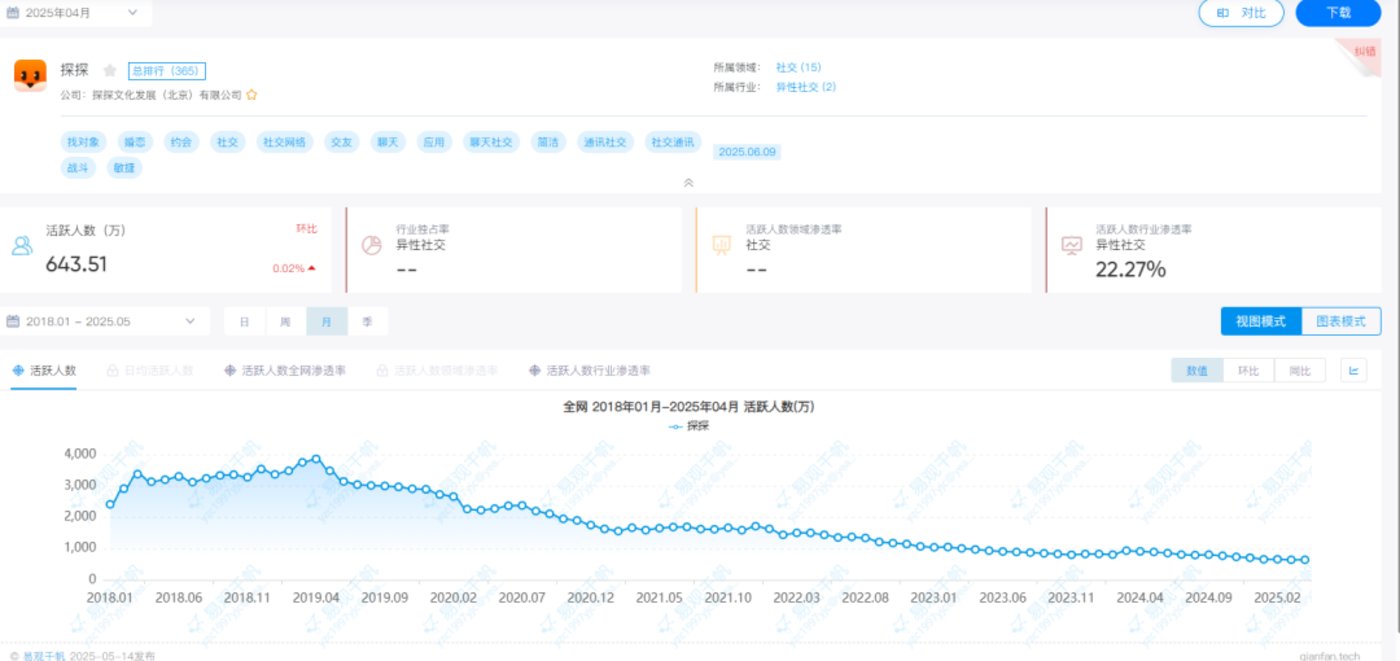 图注:易观千帆数据显示,探探月活用户大幅度下滑
