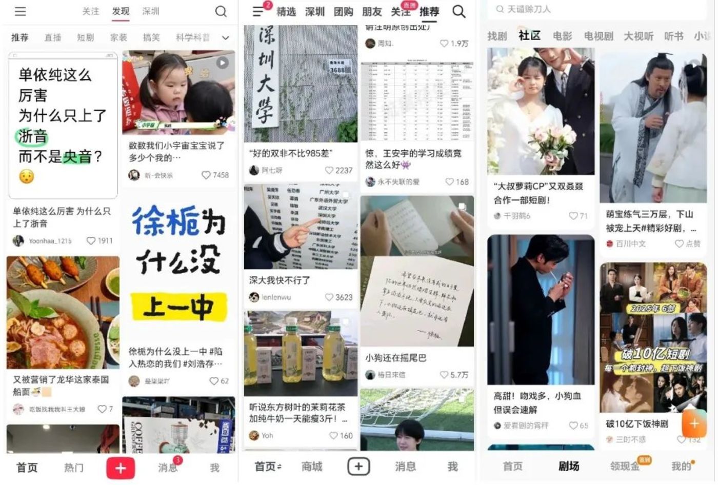 (从左往右依次为小红书、抖音、红果的界面展示)