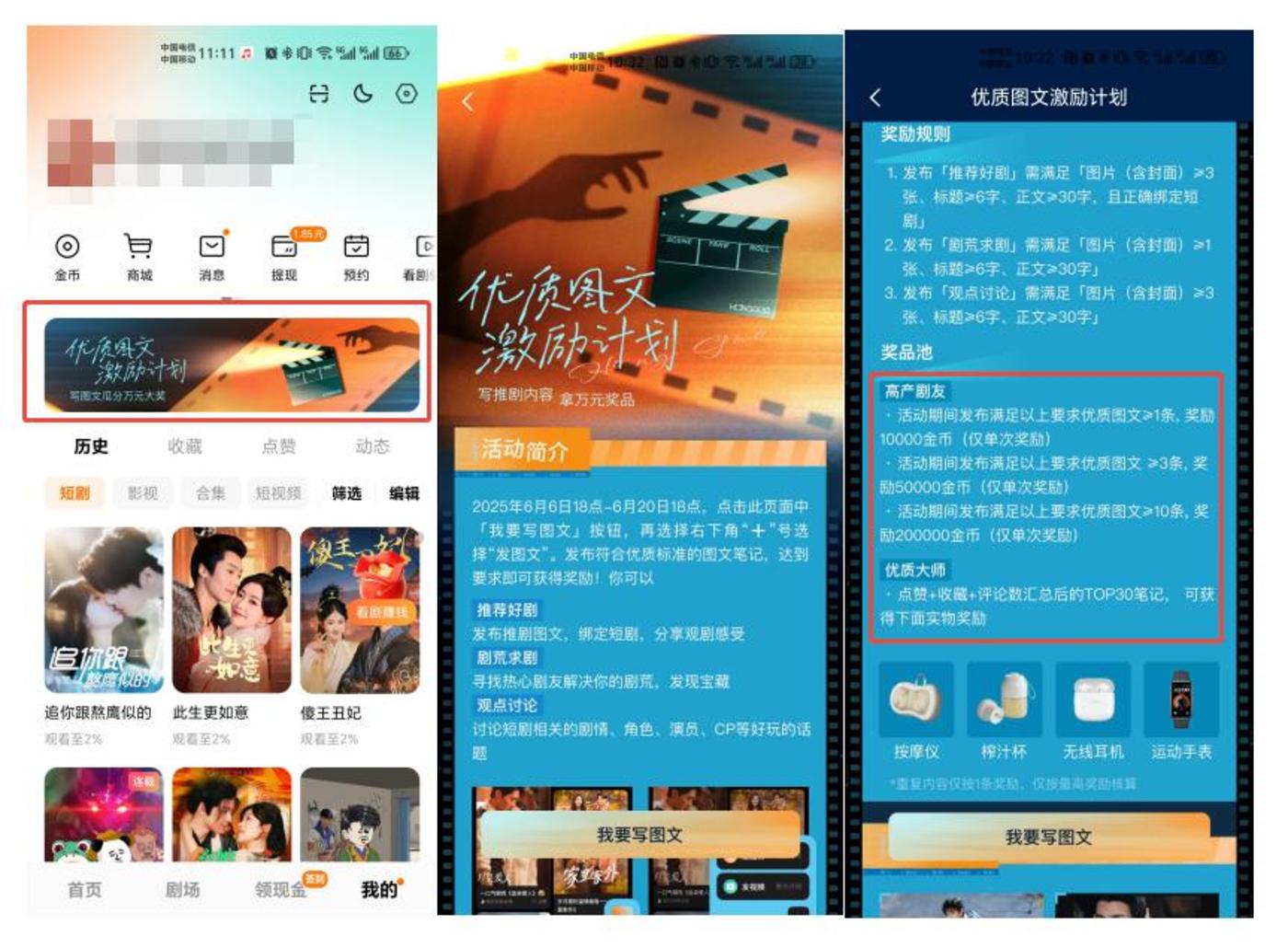 6月9日,红果开屏广告中增加了一项图文激励计划,面向所有的用户,只要成功发布1条优质图文即可获得1万金币激励,超10条优质图文可获得20万金币奖励,金币数量达到一定数额可进行提现,按照红果内的金币兑换汇率,10000金币约为1元。