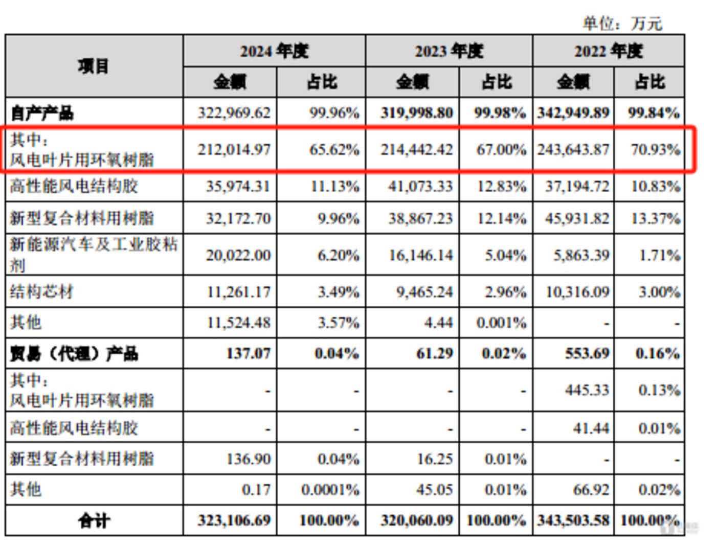 从产品上看,道生天合主要拥有风电叶片用环氧树脂、高性能风电结构胶、新型复合材料用树脂、新能源汽车及工业胶粘剂、结构芯材等,其中风电叶片用环氧树脂产生的销售收入分别为24.36亿元、21.44亿元、21.2亿元,分别占当期主营业收入的70.93%、67%、65.62%。