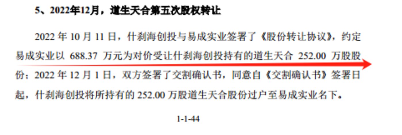 这类股权交易的异常操作仍在延续。2022年12月,什刹海创投与易成实业签署了《股份转让协议》,约定易成实业以688.37万元为对价受让什刹海创投持有的道生天合252万股股份,折合每股2.73元。同月,君联相道、经乾二号与易成实业分别签署了《股份转让协议》,约定经乾二号以2000万元为对价受让易成实业持有的道生天合 288万股股份、君联相道以2000万元为对价受让易成实业持有的道生天合288万股股份,折合每股6.94元。这意味着,易成实业在短短数日内完成“低买高卖”的套利循环,单股价差达4.21元,收益率高达154%。