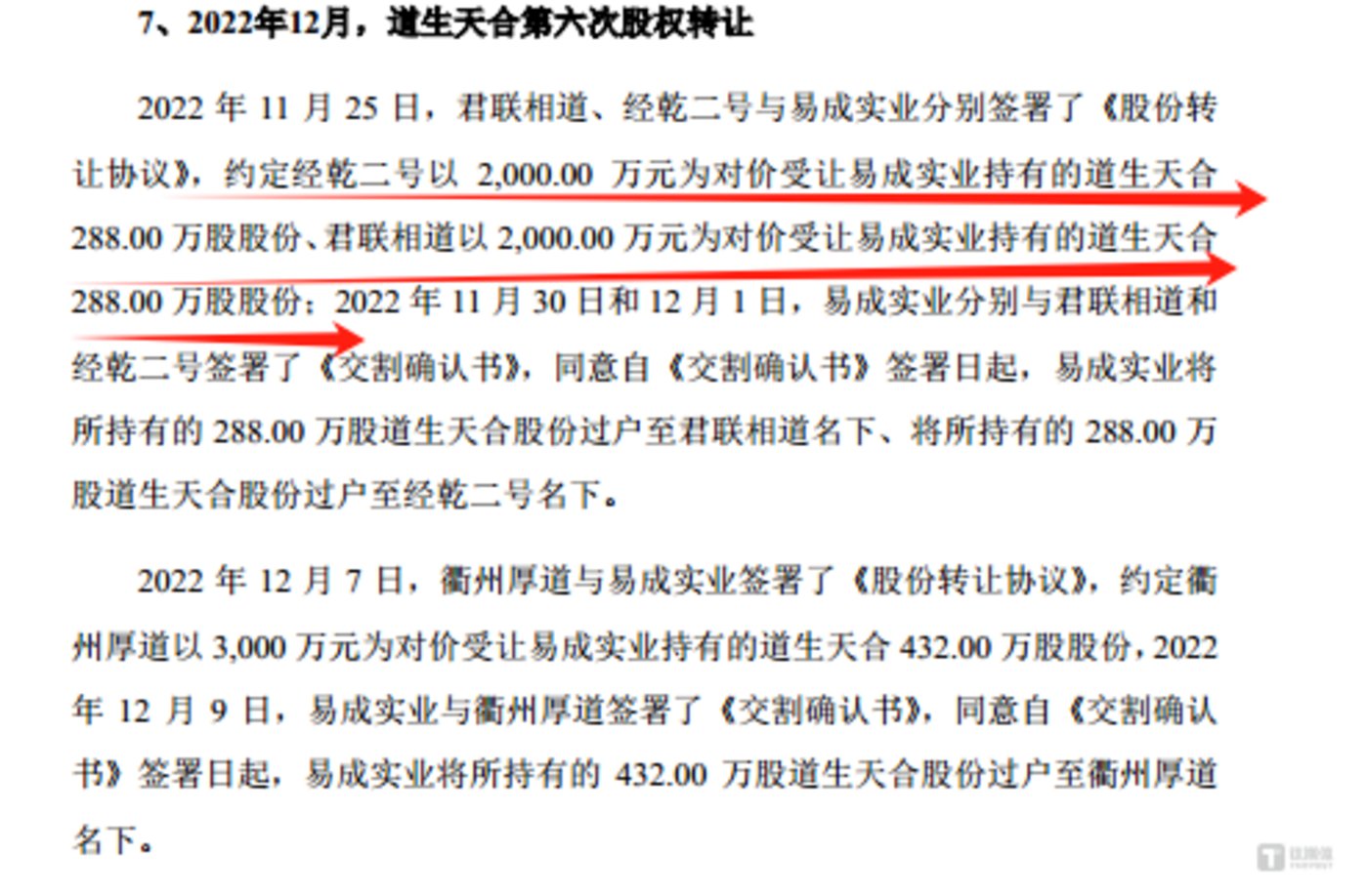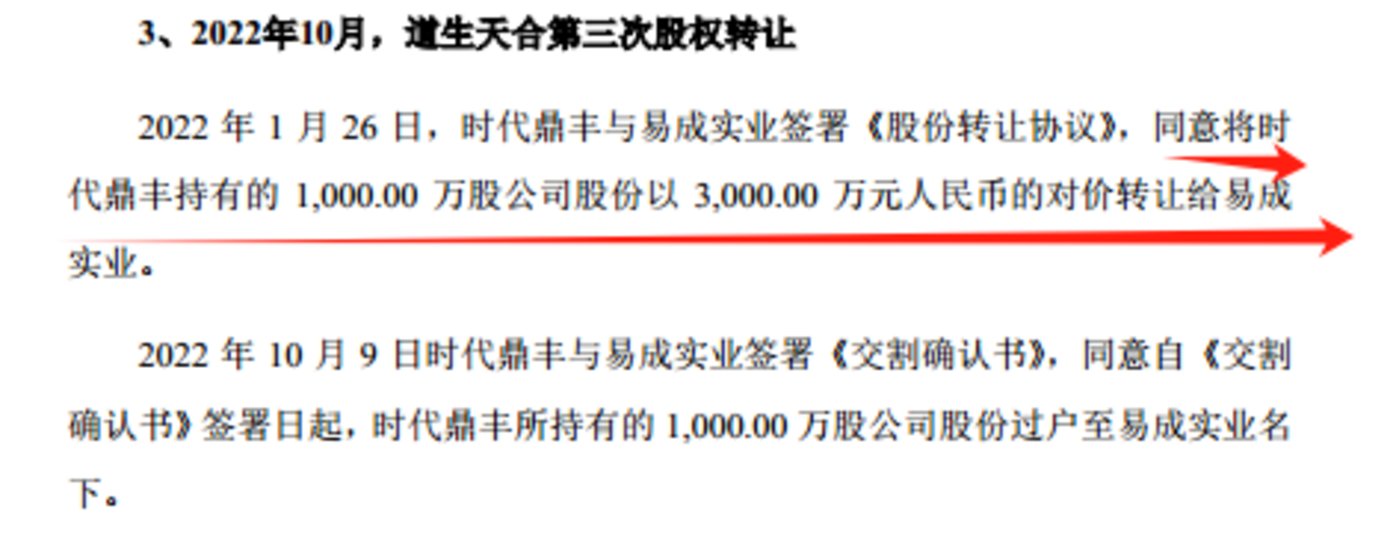 笔者注意到,道生天合的IPO申报稿于2023年6月获上交所受理,而在这一时间点的前8个月,易成实业一系列资本操作引发关注。据悉,2022年10月,时代鼎丰与易成实业签署《股份转让协议》,同意将时代鼎丰持有的1000万股道生天合股份以3000万元人民币的对价转让给易成实业,折合每股3元。