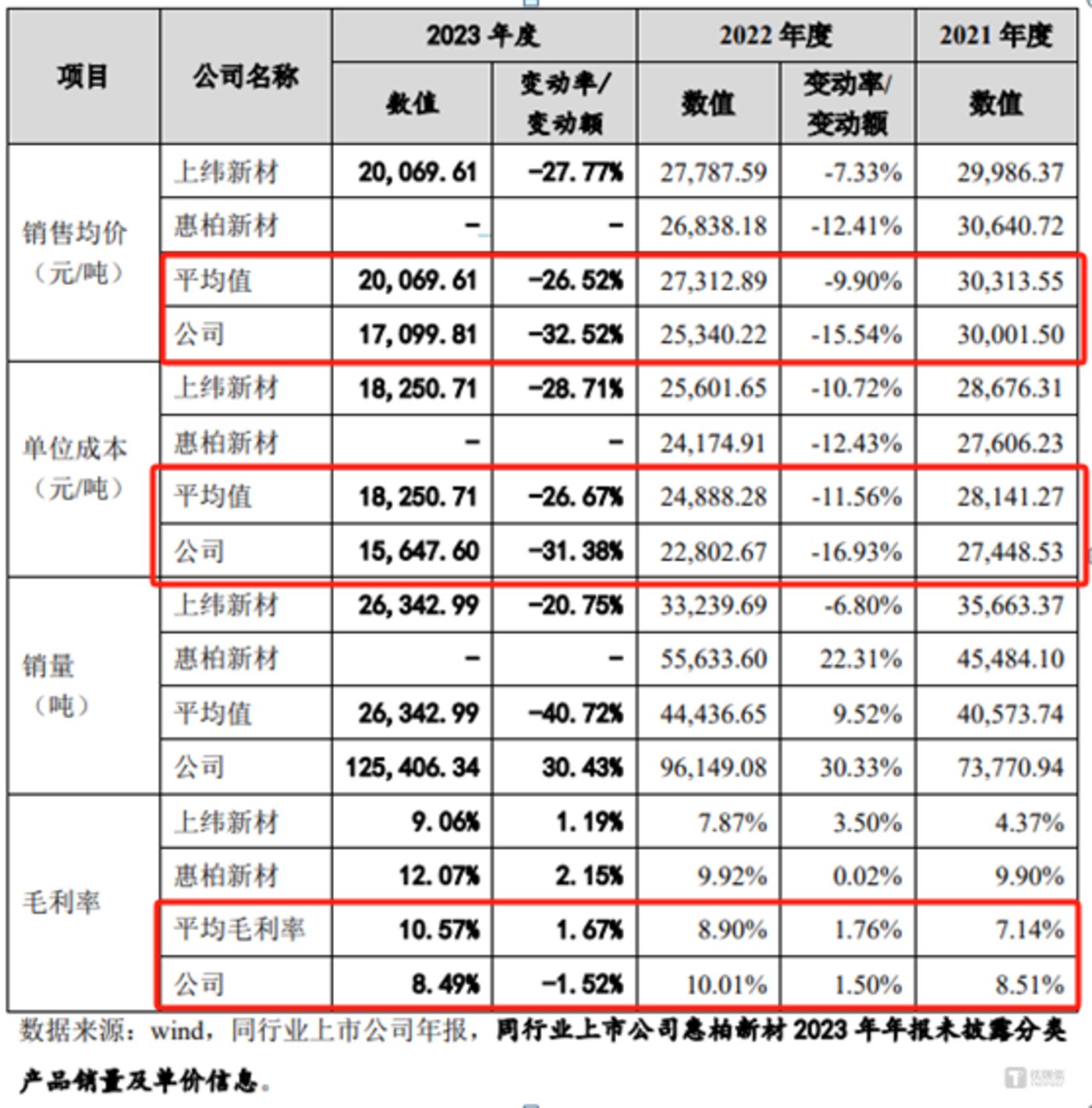 然而,在销售均价大幅下滑的背景之下,道生天合的毛利率却表现得较为平稳。报告期内,道生天合风电叶片用环氧树脂的毛利率分别为10.01%、8.49%、8.82%,呈现先降后升的现象,其中2024年,风电叶片用环氧树脂在销售均价同比下滑13.34%,毛利率却同比增长了0.33个百分点。
