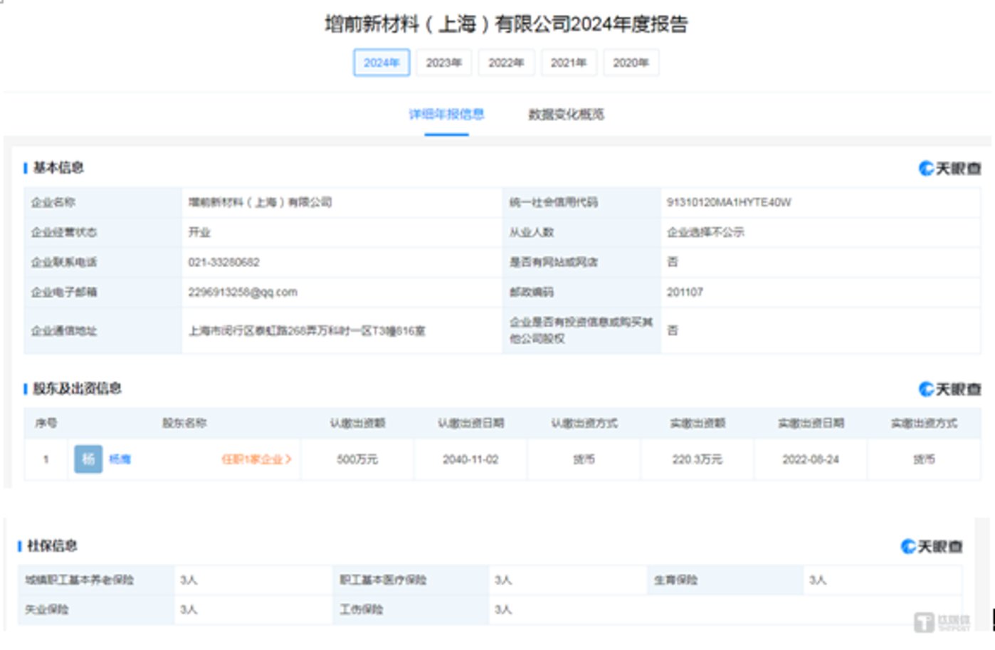 另外,天眼查显示,增前新材料成立于2020年11月,注册资本为500万元,截至2024年末,公司的实缴资本为220.3万元,仅有3名员工缴纳社保。
