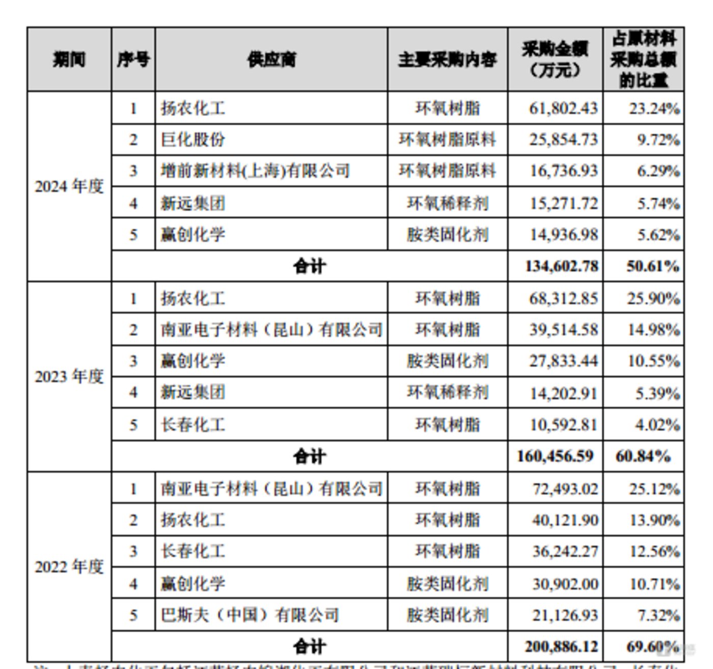 从上表可知,2021年-2023年,道生天合风电叶片用环氧树脂的销售单价均远低于同行均值,特别是2021年和2022年,在销售单价远低于同行均值的背景下,该产品的毛利率却至少能超越同行均值1个百分点以上。这一 “价低利高”的异常组合,经成本结构穿透分析,核心差异直指原材料采购成本,再次对比上述表格,可以明显的发现,上述现象产生的主要因素皆来自采购成本低所致。道生天合到底从哪里可以采购如此多低价的原材料?