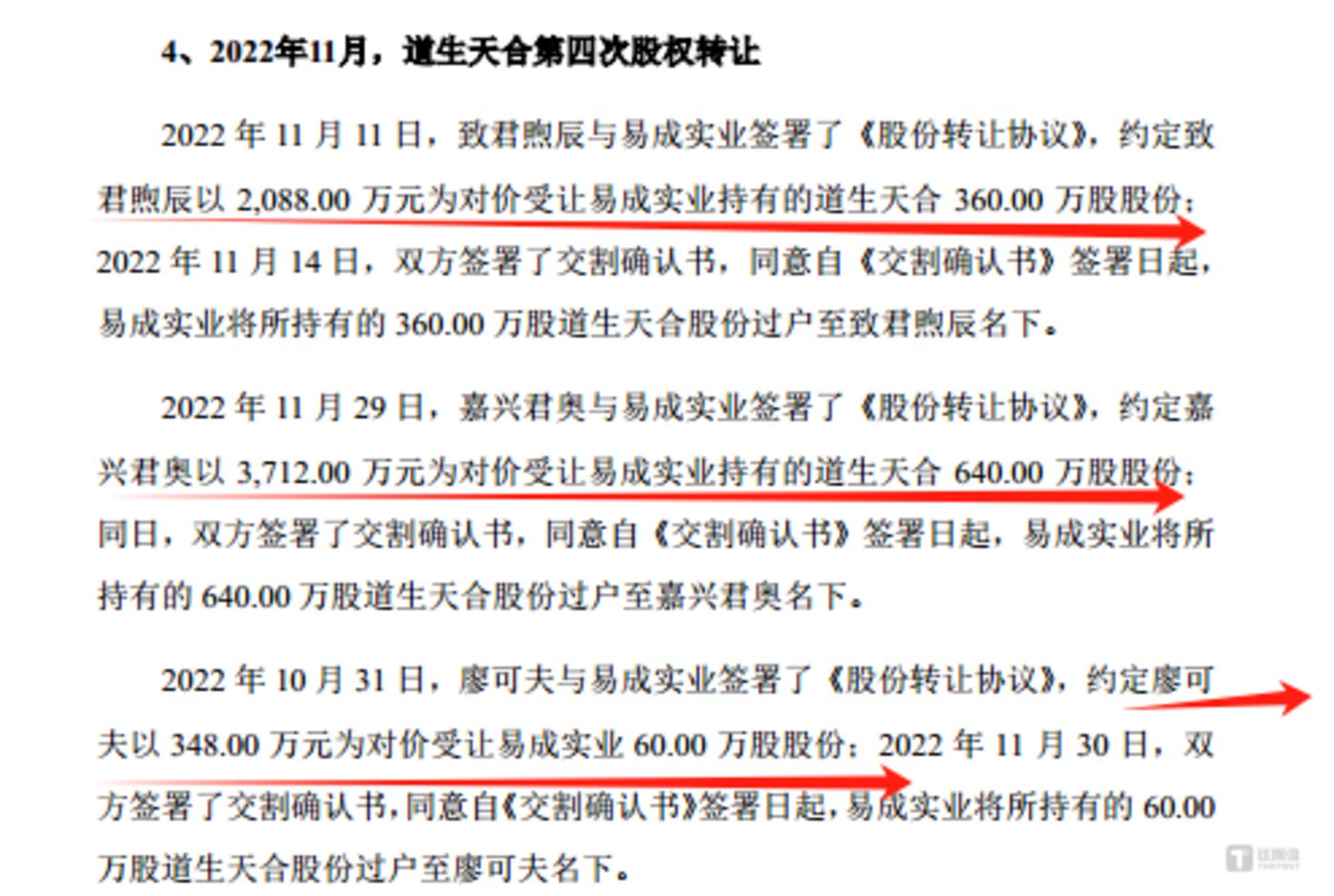 2022年11月,致君煦辰与易成实业签署了《股份转让协议》,约定致君煦辰以2088万元为对价受让易成实业持有的道生天合360万股股份;嘉兴君奥与易成实业签署了《股份转让协议》,约定嘉兴君奥以3710万元为对价受让易成实业持有的道生天合640万股股份;廖可夫与易成实业签署了《股份转让协议》,约定廖可夫以348万元为对价受让易成实业60万股股份,上述股权转让的价格均为5.8元/股。
