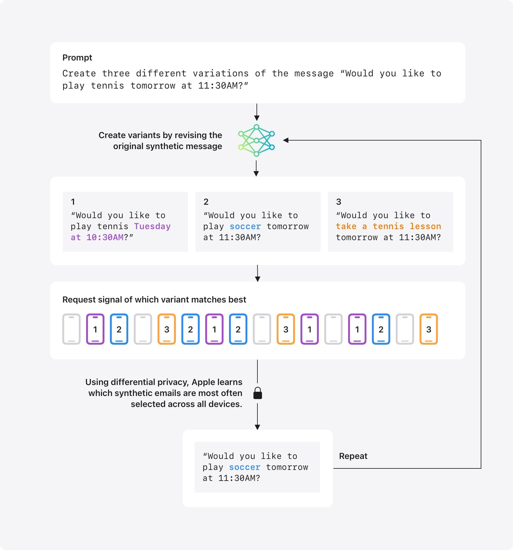 为解决数据收集的问题,苹果在继续打隐私安全牌的同时,给出了“差分隐私”(数据不会和个体一一对应)和采用合成数据的解法。