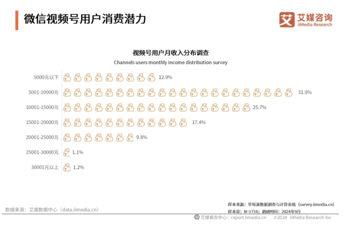 刺猬公社观察发现,这些在视频号消费的中老年客群,大多有存款和退休金,在同龄人中消费能力较强。iiMedia Research(艾媒咨询)《2024年微信视频号用户画像与行为洞察报告》数据显示,此次受访视频号用户的月收入水平集中在5001-15000元间,占比将近六成。