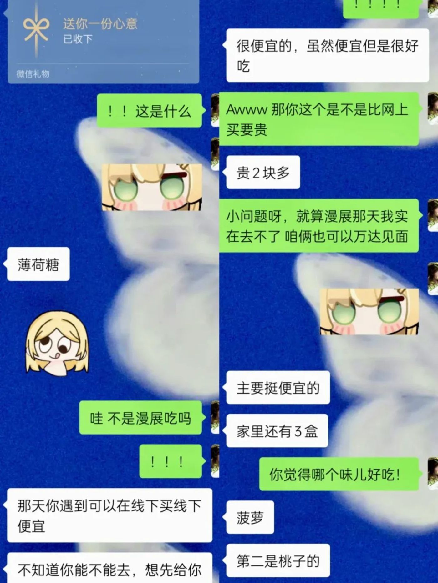 在网上成为朋友后,两人打算约一次线下漫展,但艾亭无法确定是否能赴约。一天,艾亭对话框弹出一个微信礼物的小蓝包,是奇奇发来的,因为担心她可能无法赴约,又因为这个糖很好吃,就打算买给她尝尝。艾亭则在拼多多上买了一个小礼物作为回礼。