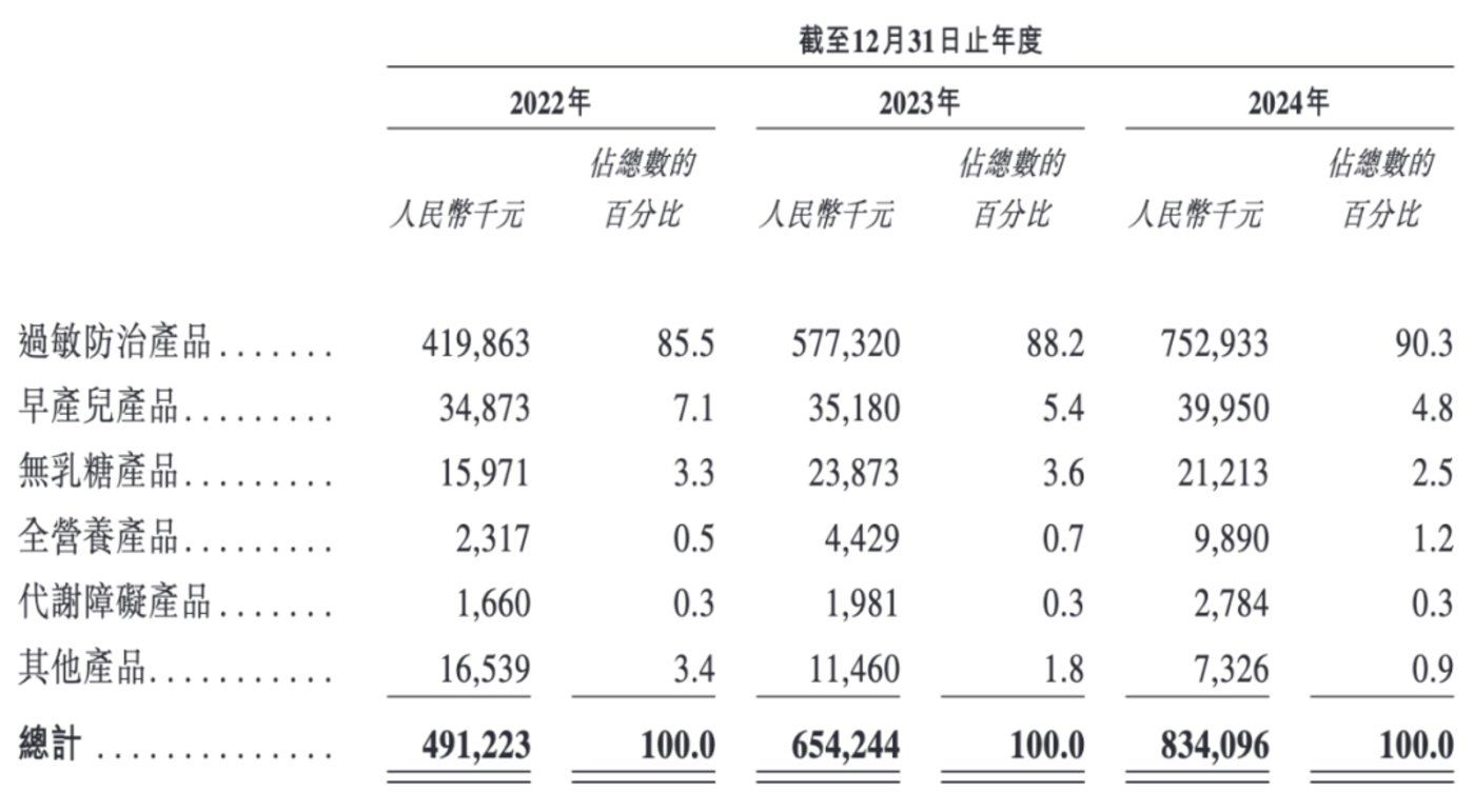 招股书披露,按不同类别的产品营收来看,报告期内,公司的过敏防治产品营收分别约为4.2亿元、5.77亿元和7.53亿元,占比分别为85.5%、88.2%和90.3%。