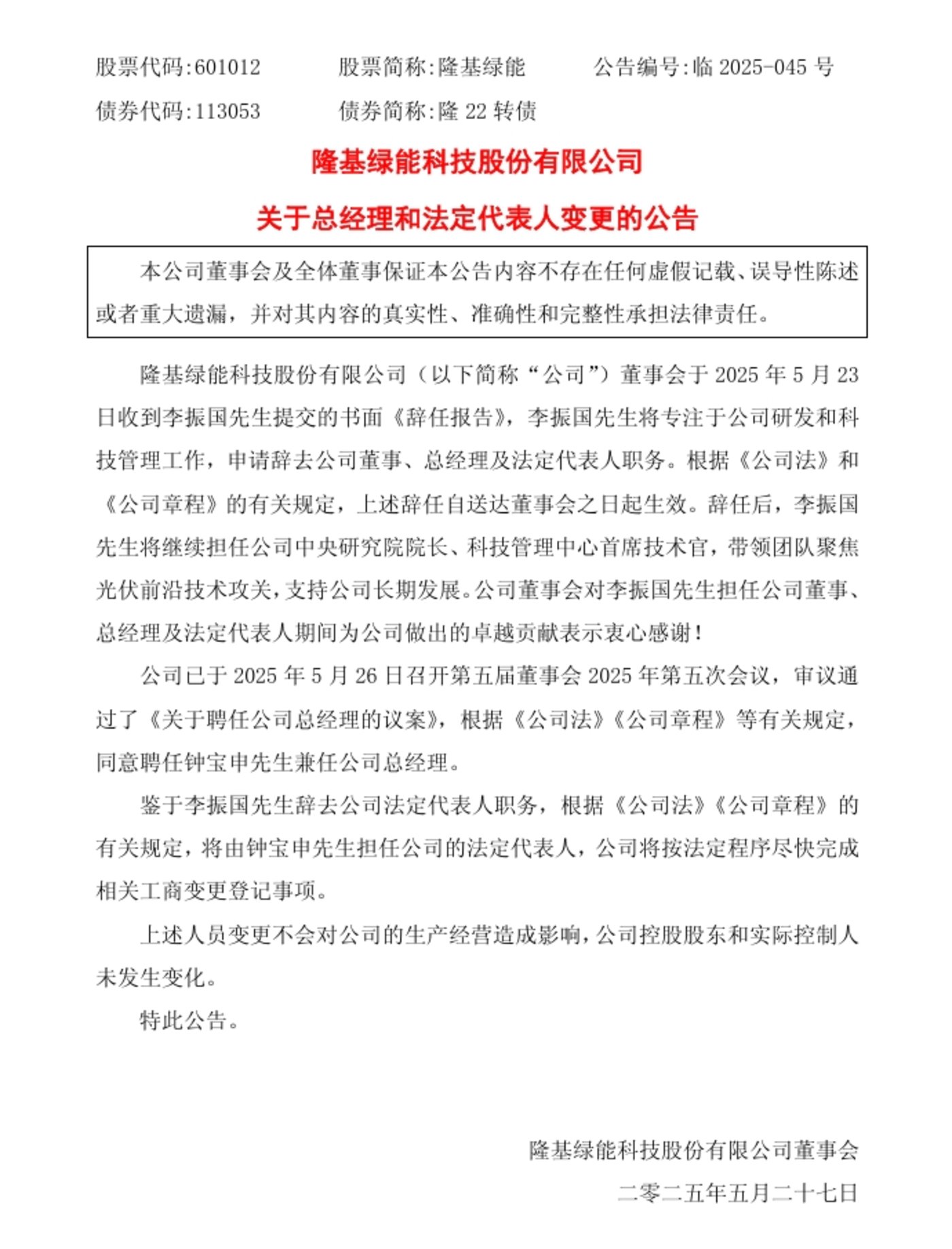 5月26日晚间,隆基绿能发布公告称,创始人李振国辞去公司董事、总经理及法定代表人职务。卸任总揽公司经营的职务后,李振国将回归科研一线,出任隆基绿能研究院院长、科技管理中心首席技术官,带领团队聚焦光伏前沿技术攻关。
