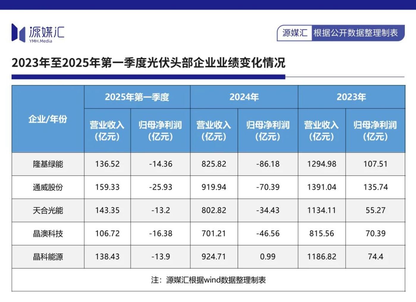 源媒汇统计发现,2024年以及2025年一季度,天合光能、通威股份等头部光伏企业,同样出现不同程度下滑和亏损。