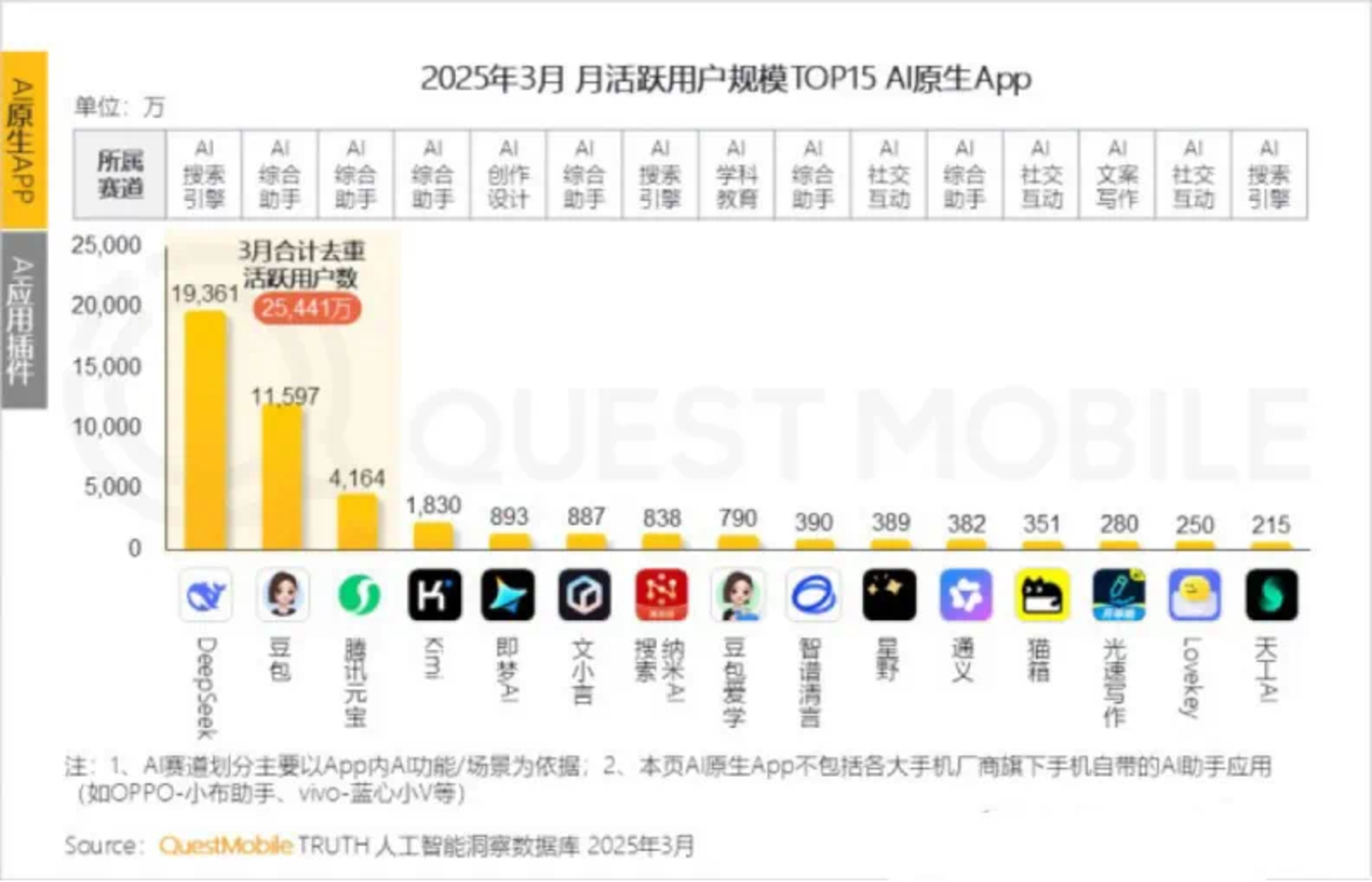 根据QuestMobile数据,截止2025年3月,在月活TOP15的AI原生APP榜上,六小龙里,月之暗面的Kimi从原本的第2滑到第4,月活仍为千万档,智谱、MiniMax包揽9、10位,月活不到千万,昆仑万维排在最末位,其天工AI月活为215万。