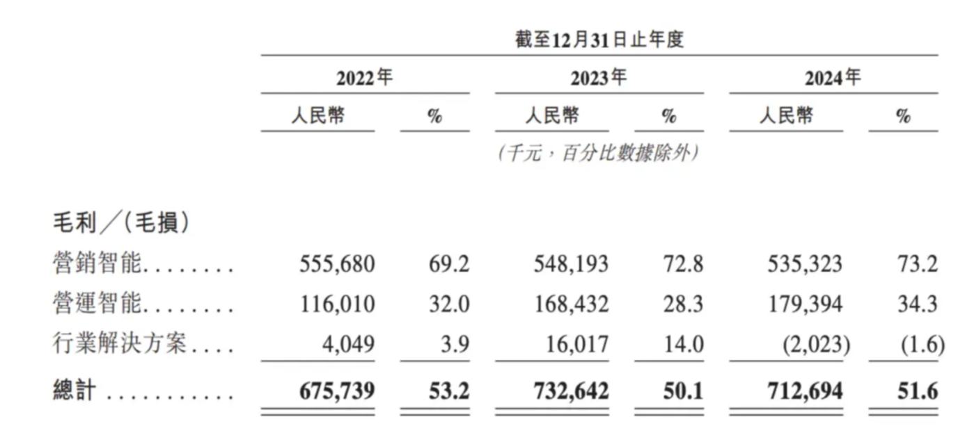 但明略科技在特定行业的经验可能相对较少,难以深入了解和满足多个行业的复杂需求和特殊要求。在商业化前期需要大量的时间和资源进行铺垫,后续同样需要进行客户维护和产品优化。或因如此,明略科技的行业解决方案表现差强人意,2022年到2024年,行业解决方案分别贡献了404.9万元、1601.7万元和-202.3万元的毛利。