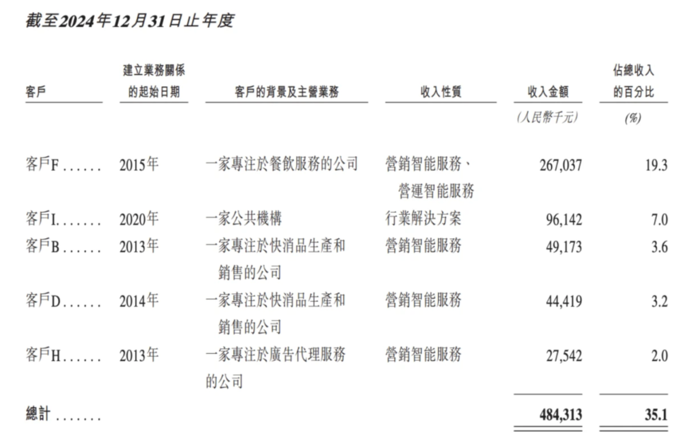 2024年,五大客户为明略科技贡献了4.84亿元,同比减少7.98%。其中有四家公司,都是在2015年之前建立的合作关系,仅有一家合作伙伴是2020年新开始合作。不但拓新能力有待提高,明略科技的客户留存也开始暴露问题。2024年,明略科技的客户总数1841家,较2023年减少39家。